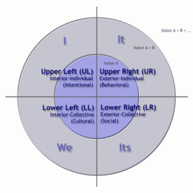 It is this double axis that results in integral theory’s most commonly reproduced diagram, known as “AQAL” (pronounced “ah-kwahl”), which stands for “all quadrants, all levels,” and which, at its most basic, looks something like this (though variations abound):