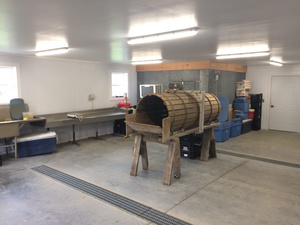 Smaller market farms may have a very simple, open packshed design consisting of “four sticks and a lid” used primarily during the summer months. The floor of these structures could be anything: a dirt floor, grass, or gravel surface. If you choose to have a dirt floor, consider laying down weed mat or landscape fabric to create a tidy work environment. It is helpful to consider drainage, specifically providing intentional drains from wash tanks and sinks that direct outflow away from the work area, production areas and bodies of water. The intent is to keep the surface underfoot relatively dry and free of standing water, prevent cross-contamination between drainage water and production areas and to prevent nutrient loading in bodies of water.