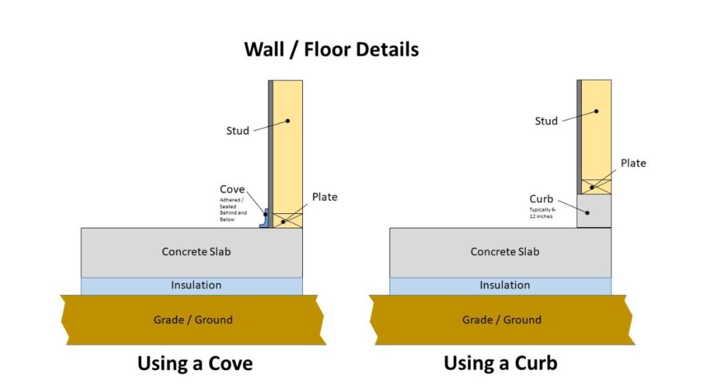 Curbing and cove bases provide an intentional transition between walls and floor to allow for improved water drainage and cleanability. Concrete can be poured to provide “curbing” with a radius that walls can be built upon. Additionally, cove base (rubber or tile baseboard trim) can be installed to seal this corner and improve cleanability between the wall and the floor. This avoids the creation of an open seam which can be challenging to clean since it collects dirt and debris and can “harbor” or hold water and pathogens. “Harborage” sites are places where water and pathogens can enter and be protected from cleaning, and sanitizing, and drying. This can lead to cross-contamination and can also lead to premature rot of building materials.