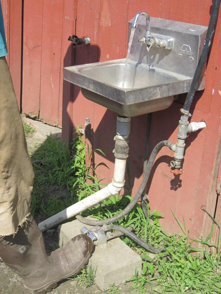 Your wash water generally doesn’t need to go into a septic system but check with local officials. Guidance for vegetable wash water discharge in Vermont can be found here. Sink drains should be “broken”, resulting in an air gap for prevention of backflow in the event of a clogged drain backing up into your fresh produce.