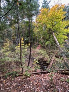 I chose to make my phenology spot in Centennial woods because it was an area I discovered earlier in the year due to another assignment in NR 1. In order to get to my location in Centennial you would follow the main trial over the long bridge and once you reach the trailhead where left takes you down to the water and right goes up the hill you go left. A low area, the shores of a small but steadily flowing rocky stream. In this place you can find many downed trees intermingled with the living ones. Multiple species can be found here but some of the most common ones are eastern hemlock, american beech, and ferns covering the floor.