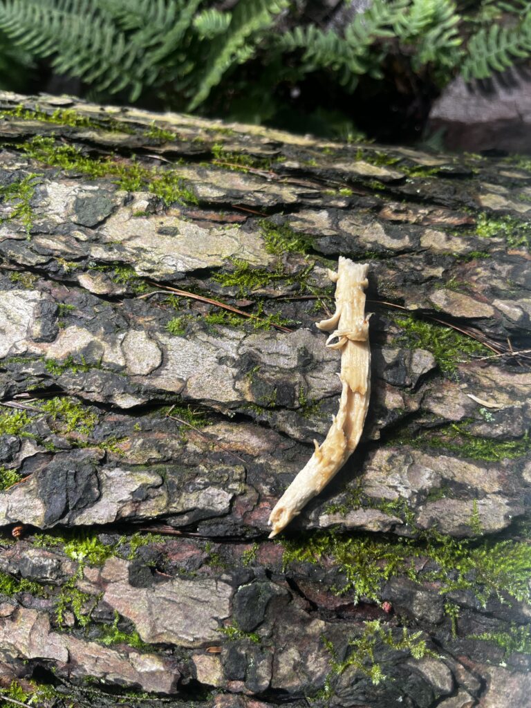 A mushroom stem laying on the hemlock log with some “samples” taken out of it, likely by a small mammal.