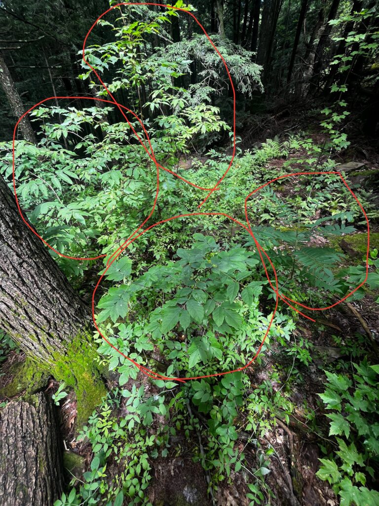 The four largest plants in the gap, clockwise from the top: pin cherry, staghorn sumac, green ash, elderberry.
