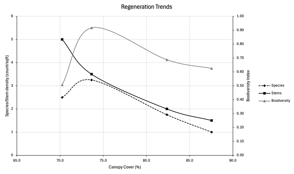 Below is a graph of my results with the number of species, number of individual stems and biodiversity index compared to the percent canopy cover. Note that the x-axis only goes from 65% to 90%. The number of stems per square foot has an inverse relationship as locations with more canopy cover had, on average, less stems growing. However, the number of species per square foot and the biodiversity peaked in the plots 6 feet from the center of the gap and decreased with higher and lower levels of light.