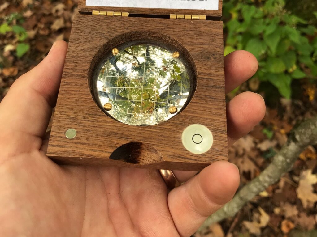 4. At home, I wrote a MATLAB script to calculate the percent canopy cover by determining how many of the pixels in the picture were of plants vs sky. In forestry, a canopy densiometer would actually be used in this instance although those instruments are ridiculously expensive for what they are (a curved mirror with a grid of squares). A densiometer is used by holding it flat and counting how many quadrants of each square are showing the sky versus plants. Because densiometers have 24 squares, a total of 96 quadrants and you usually take 4 measurements looking in each direction at each plot, I decided to reduce the resolution of the pictures I took to have a coarser pixel (or quadrant) resolution. A picture of a forest densiometer is shown below.