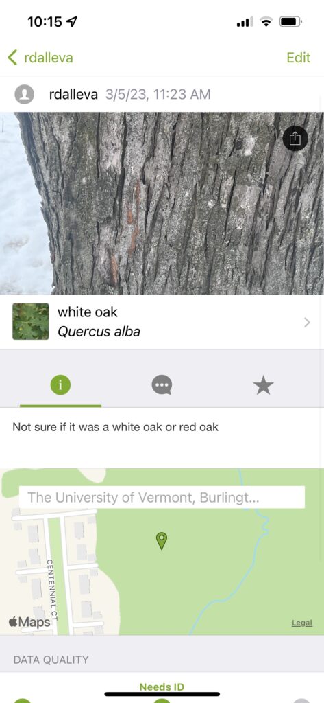 I had some trouble finding any of the species that we were supposed to look for as the trees either had no leaves or were too high up for me to properly look at. That also meant I couldn’t reach the twigs of the tree either which did not help. I did end up finding a tree that I could not tell if it was a Red or White Oak, which is the one I chose to upload to INaturalist