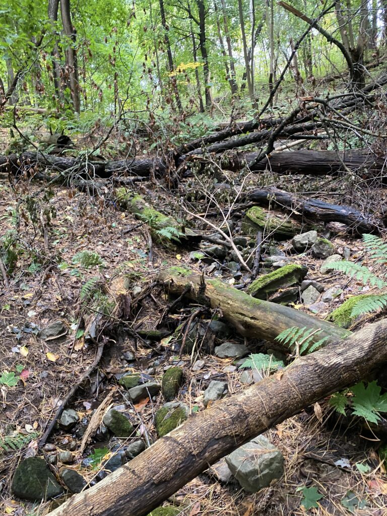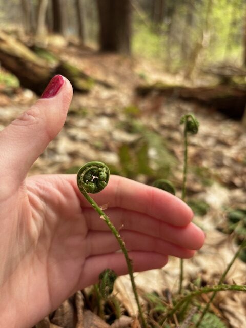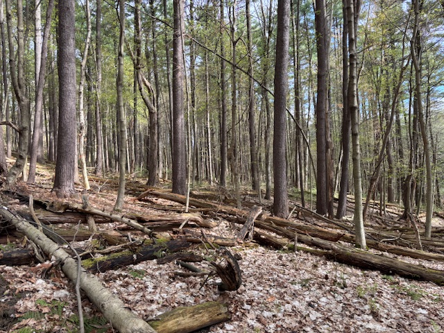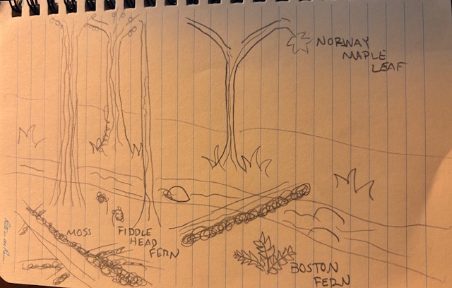 Being the first Spring I’ve spent here, this is not only the first time I’ve seen my site in bloom, but all of Vermont and it has not disappointed. When I visited my site for the first time, the leaves were already turning and fall was beginning. It was green when we arrived, but seeing it after such a long winter feels like I am seeing it all for the first time. From fall to winter to now spring, my site is blooming for the first time. I saw buds on every tree, mosses, grass, full Norway maple leaves, and even fiddlehead ferns! My site was also crawling with bugs again. One new thing I noticed was the addition of a hummingbird feeder! It appears my site has other regular visitors, though I wasn’t able to see any hummingbirds when I was there. I was able to look up and see a dense canopy with a gorgeous example of crown shyness. The biggest indicator of my site is the beautiful creek that runs down the middle of it and across the trail, which always tells me I have arrived. There is also a beautiful old tree trunk and excess of fallen trees that have withstood all the seasons.