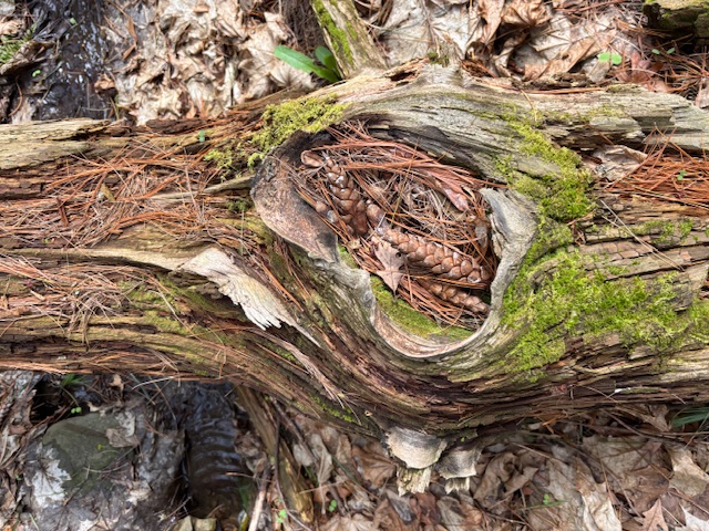 After visiting in early November, it was apparent that peak time for fall had passed as every tree had lost almost all of its leaves, causing there to be a thick layer of damp organic material across the ground. Although the trees had lost their leaves, most of the ferns were still there and I had seen a slight increase in the number of mushrooms. It had rained the previous night which would help explain the damp environment and slightly fuller brook than last time. When sitting, I could hear a very faint sound of water; rustling due to the stronger winds; and most noticeably, it was colder than the last time I was there. Similar to last time though, there was an abundance of Eastern White Pine needles on the ground: yellow in color and accompanied by their long pinecone counterparts.