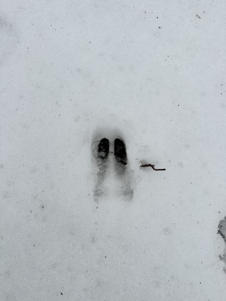 Here is one of the tracks that I found. It belongs to a whitetail deer. I found this track while walking through the redstone pines. It was a pretty simple identification as there really isn’t anything else in this area that looks similar yo a whitetail deer track.