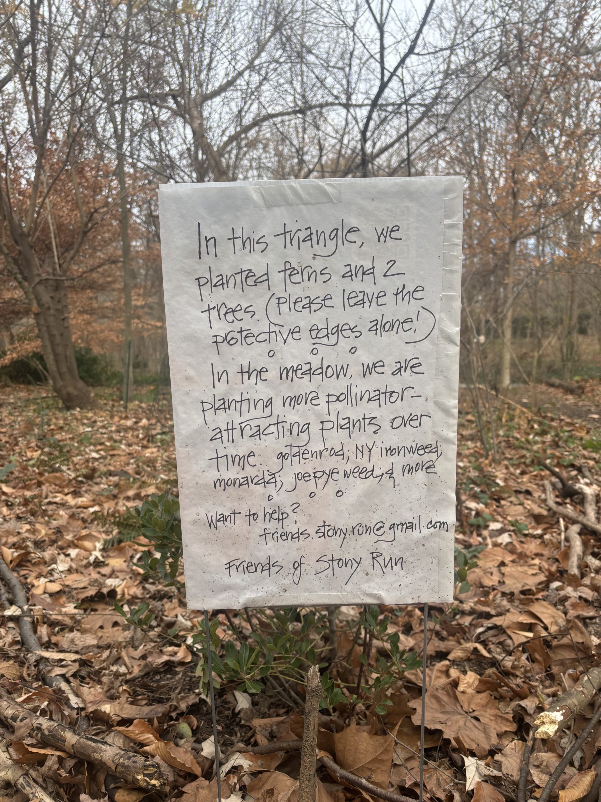 In this picture, I found a sign right by my spot that shows how much people care for the Stony Run trail.
