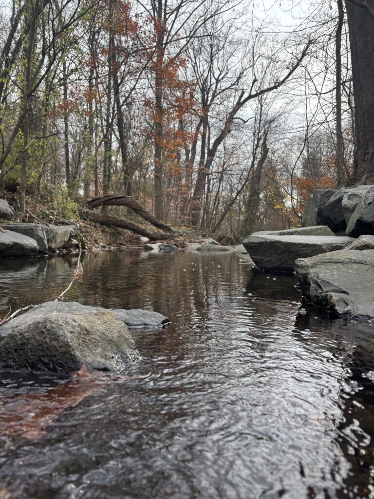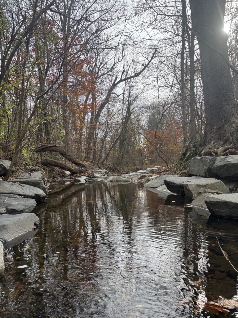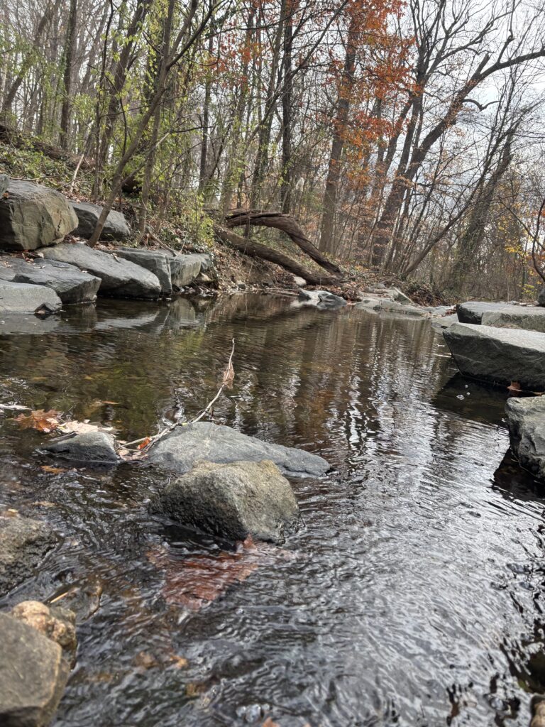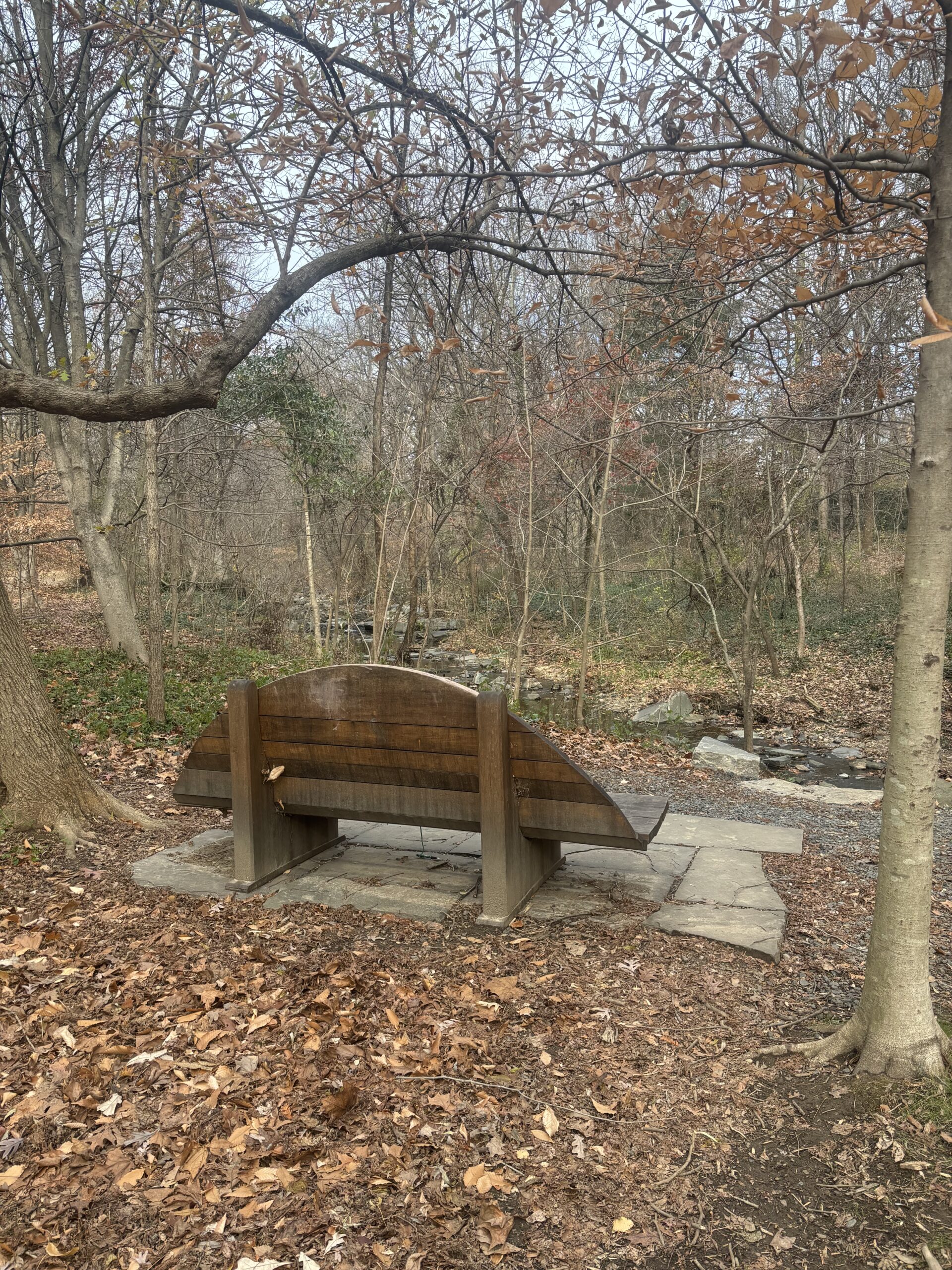 Stony Run, in Baltimore, MD, is a trail that is about 2 blocks away from my house and leads right to where I went to high school. As it is in a city, it is far from as secluded as my spot in Centennial Woods, but there are a lot of really cool things about it that I never took notice of before. Despite being near major roads, Stony Run still offers a quiet escape from the noise of the city. While sitting on the bench by the stream in the picture, I took note of a few things, the first of which was the sounds.