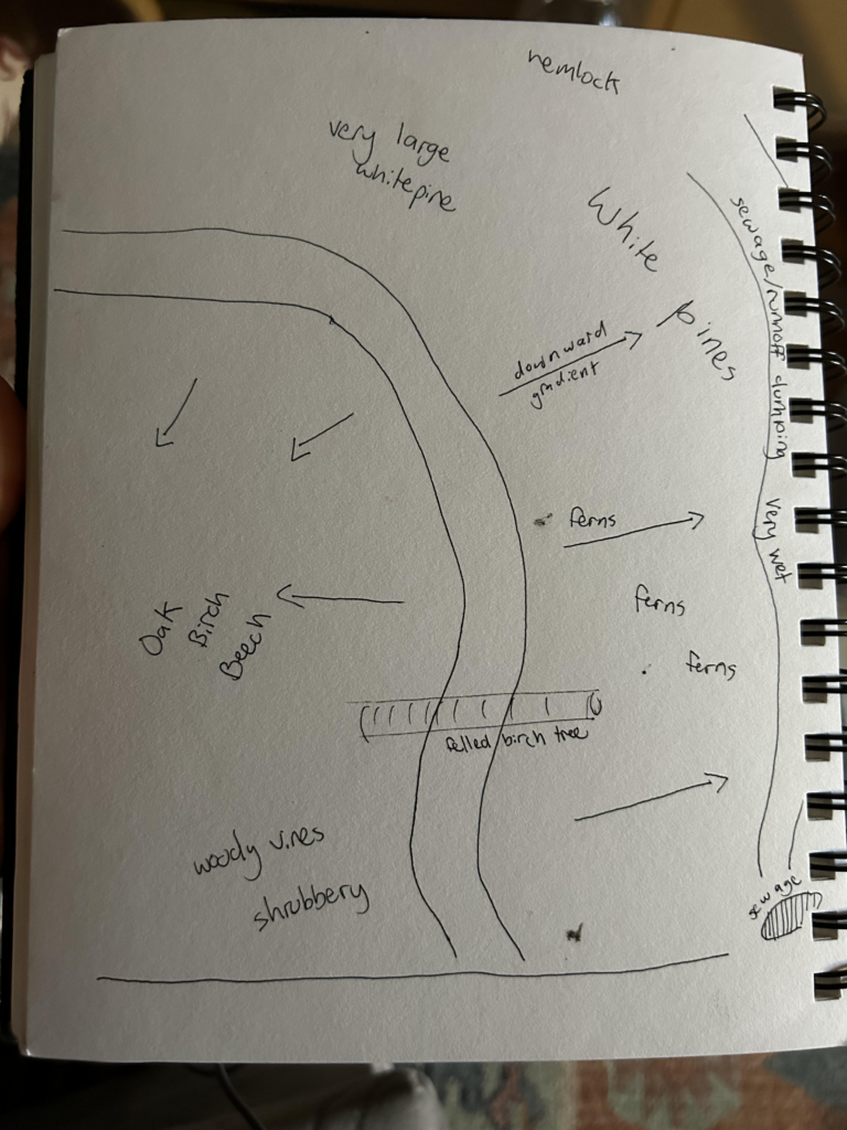 Many things have remained unchanged though: the downed tree that students often sit on, other snags with accompanying woodpecker holes, and ravine where my friends have gone digging for young ostrich ferns to eat are aspects of this landscape that despite the changing seasons, remain. Year round, I have observed students and other locals use the Trinity Woods for dog walking, smoke breaks, small walks with friends, dates, and a relaxation spot. It is clear that the local community values this place as a small bit of green forest in an otherwise mostly unwooded suburban landscape. I do consider myself a part of this place, and have made many memories here with my friends and roommates. This has been a little safe haven for me.