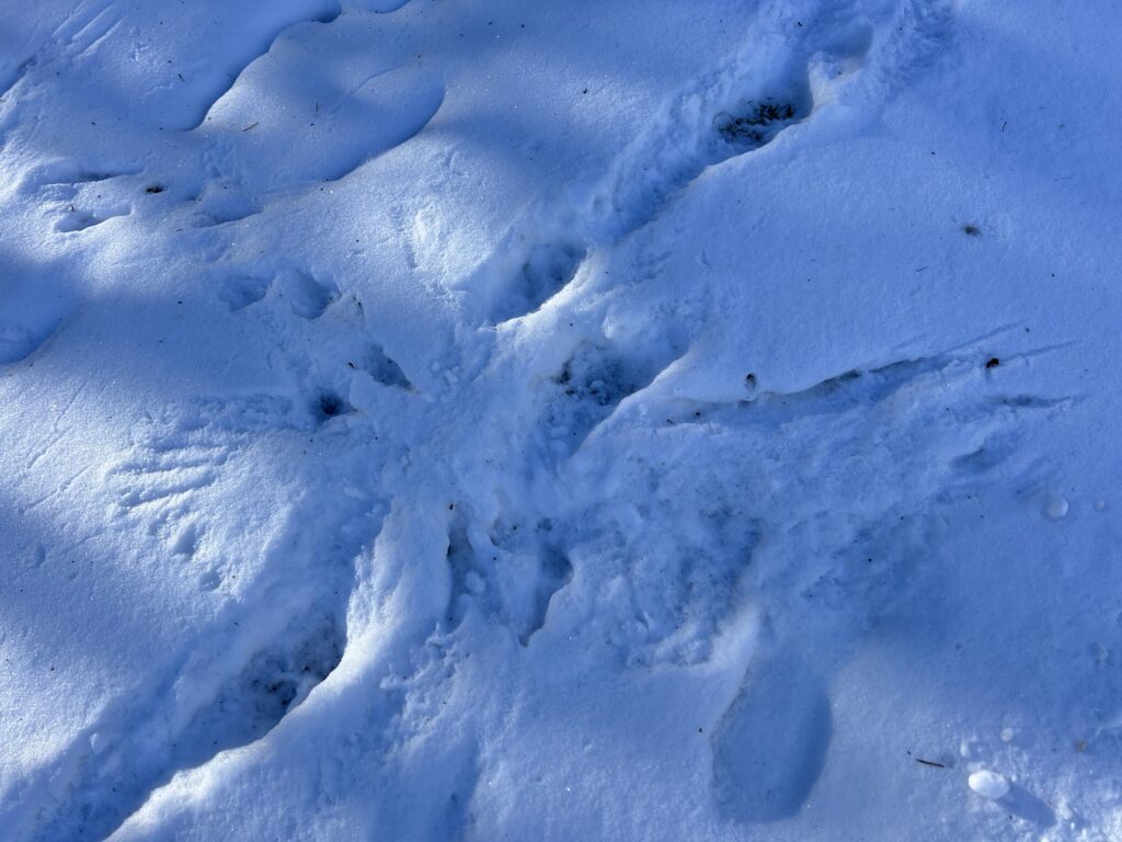 Returning to this site after the break, there is a thin dusting of snow on the ground and all of the deciduous trees have dropped their leaves. I did a little bit of tracking, and found some deer tracks and a really interesting print of a bird landing to (I’m guessing) prey on a smaller animal.