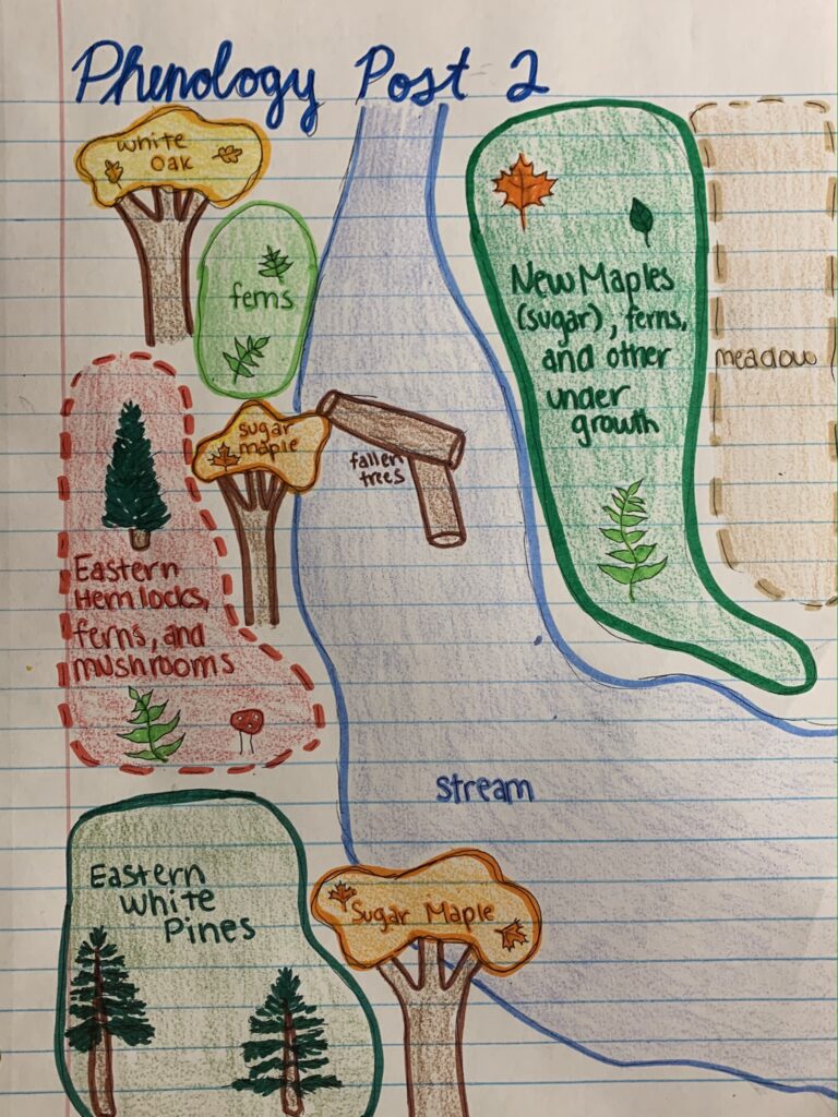 During the peaceful 15 minutes by the brook, I could smell the pines to my right as I sat on the damp ground. I felt the crunchy leaves and pine needles that lay over the forest floor. As I heard the wind blow through the trees, colorful leaves would fall into the stream which was running at a faster speed than normal as it has been rainy over the weekend. Birds and planes both flew over creating an odd symphony of sounds. Chipmunks would scale the trees creating scattering noises across the rather quiet forest. Overall, this experience was extremely relaxing and drew my attention to the small details of the area, especially the noises that can be easily drowned out if you do not remain silent to listen. The first thing I noticed when I arrived in the area was the change in leaves from the last time I visited. The sugar maples had bright yellow and red leaves while the white oak had leaves of yellow. The underbrush on the other side of the river was also changing, turning brown and barren. I have yet to see any evidence of wildlife in this area other than the live chipmunks climbing the trees.