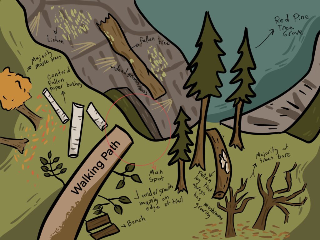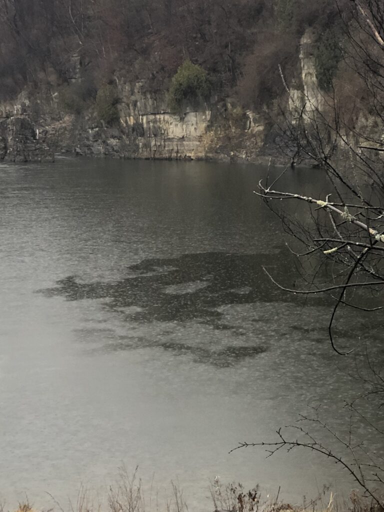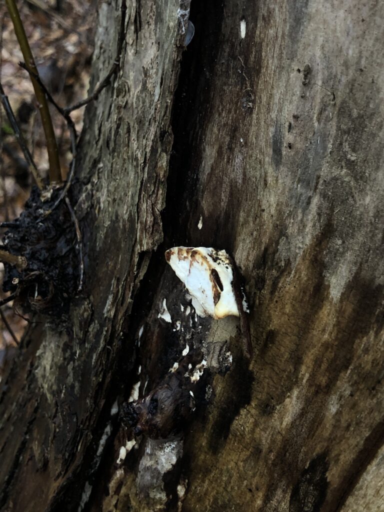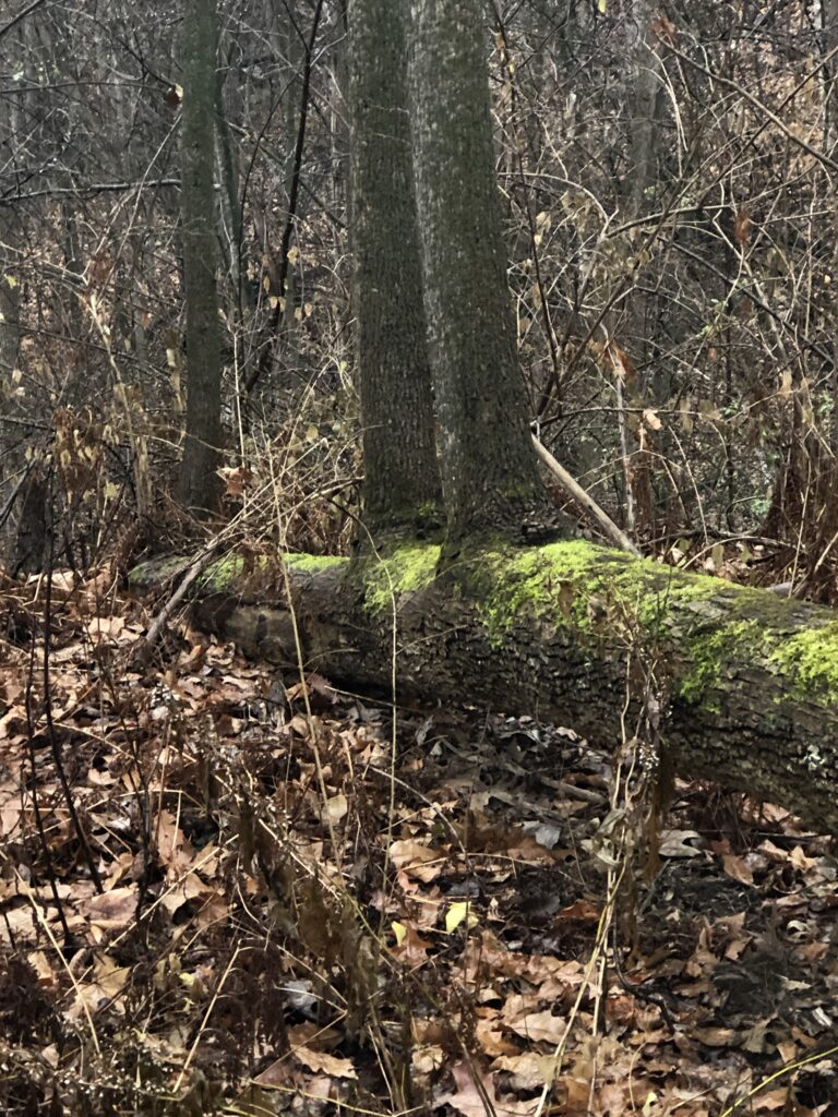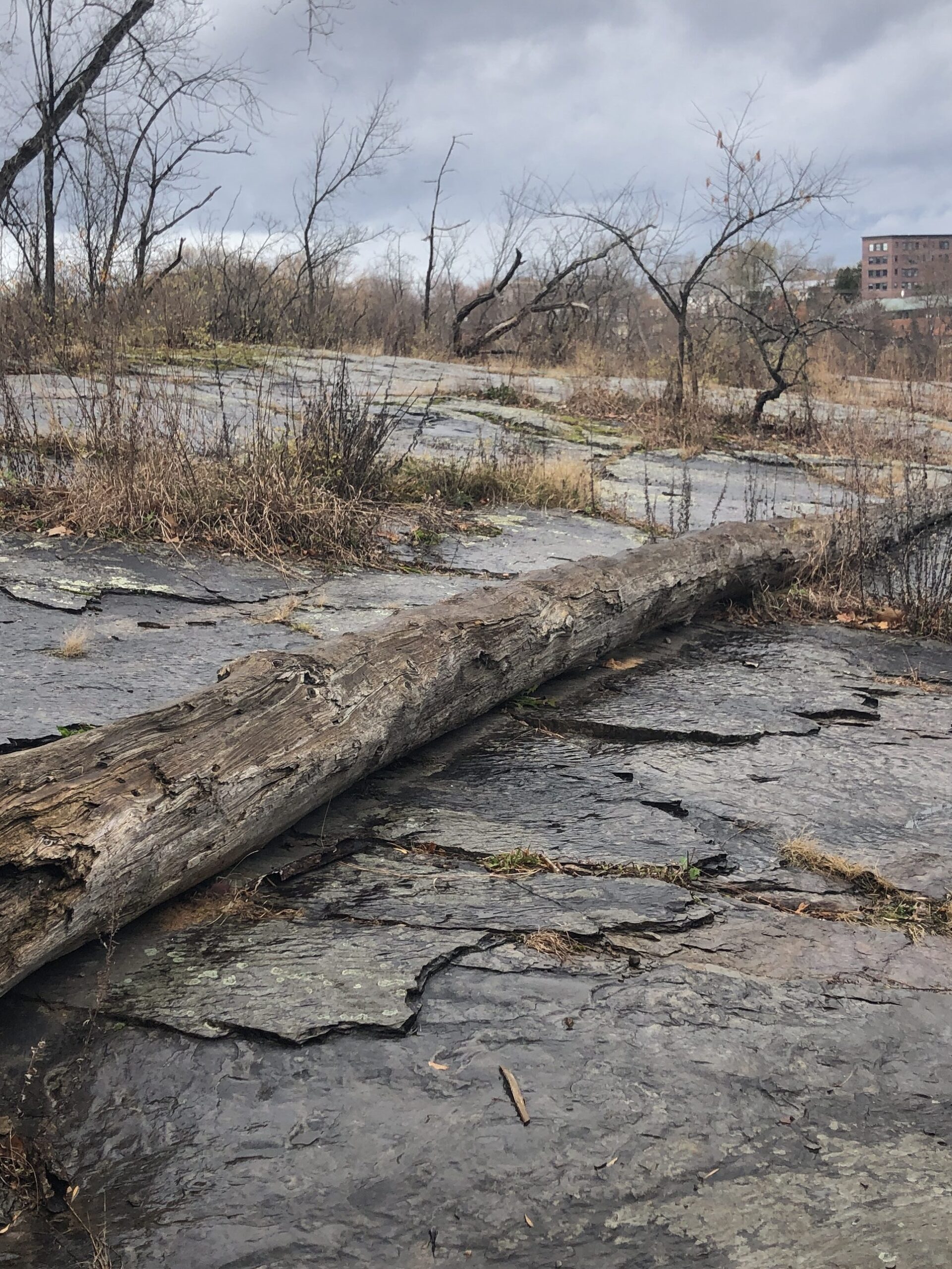 A significant landmark I have become familiar with is the log that rests on the rocks in Salmon Hole. In the fall, when I first visited, mushrooms were growing on it, and plants surrounded it. But as the year has gone on, this growth has stilted. The rocky area in Salmon Hole has a very prominent organization. The waves in the rocks and all the trees grow in the cracks.