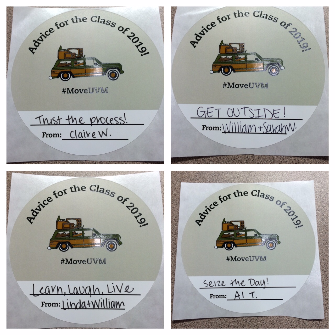 - Share your best 3 words of advice using the #moveUVM hastag. Use Instagram, Twitter, Snapchat (uvmvermont) and Facebook and we’ll put your advice on our huge 20 ft banner in the Davis Center using one of these: