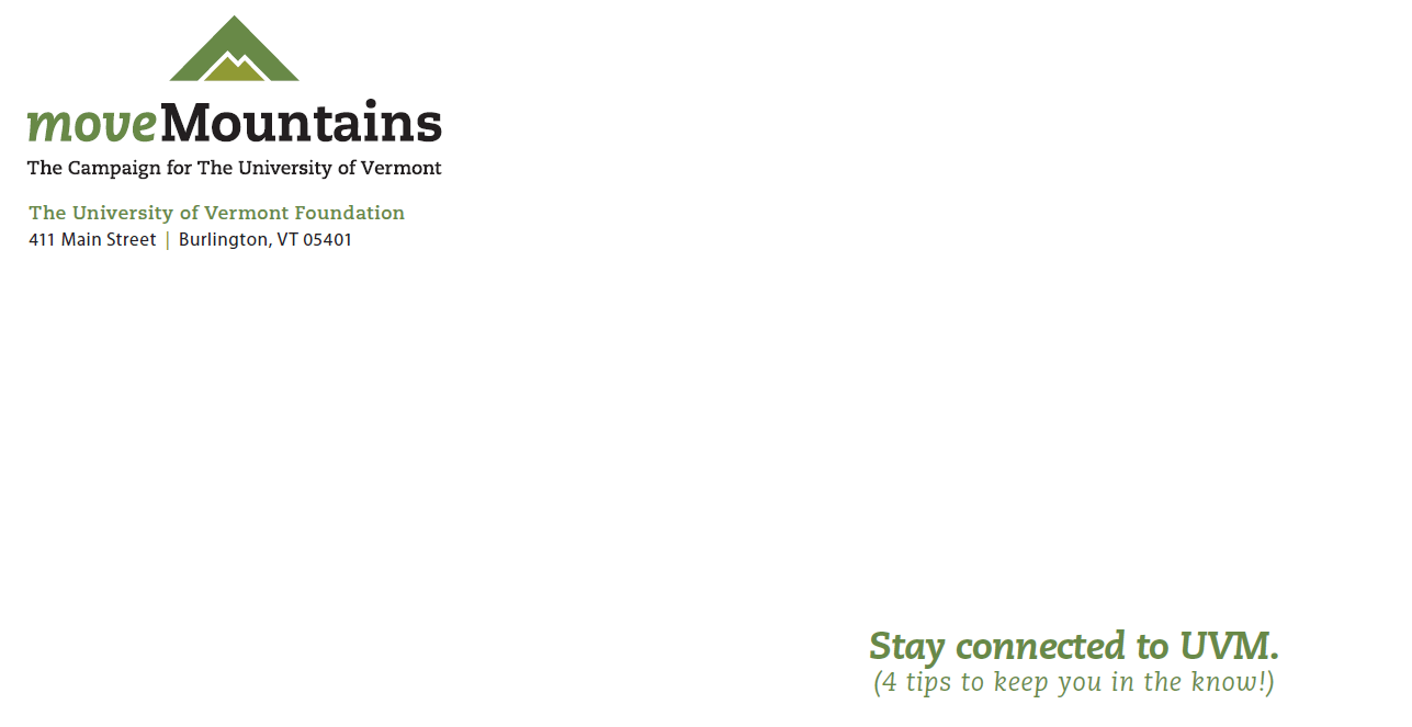 In the coming weeks you will receive a mailing from me offering tips on how to stay active in the UVM and alumni community. It will look like this: