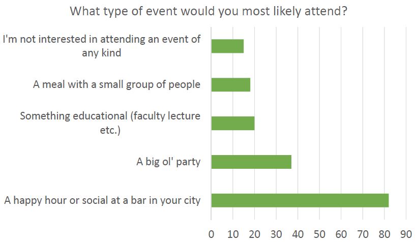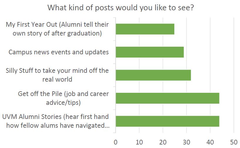 Beyond these graphs, a few of you had some great suggestions for things that we should include on the blog, including more pictures of animals, funny video skits, Greek life updates, transitioning into the job market, more UVM Alumni stories, post grad life hacks… the list goes on and on!