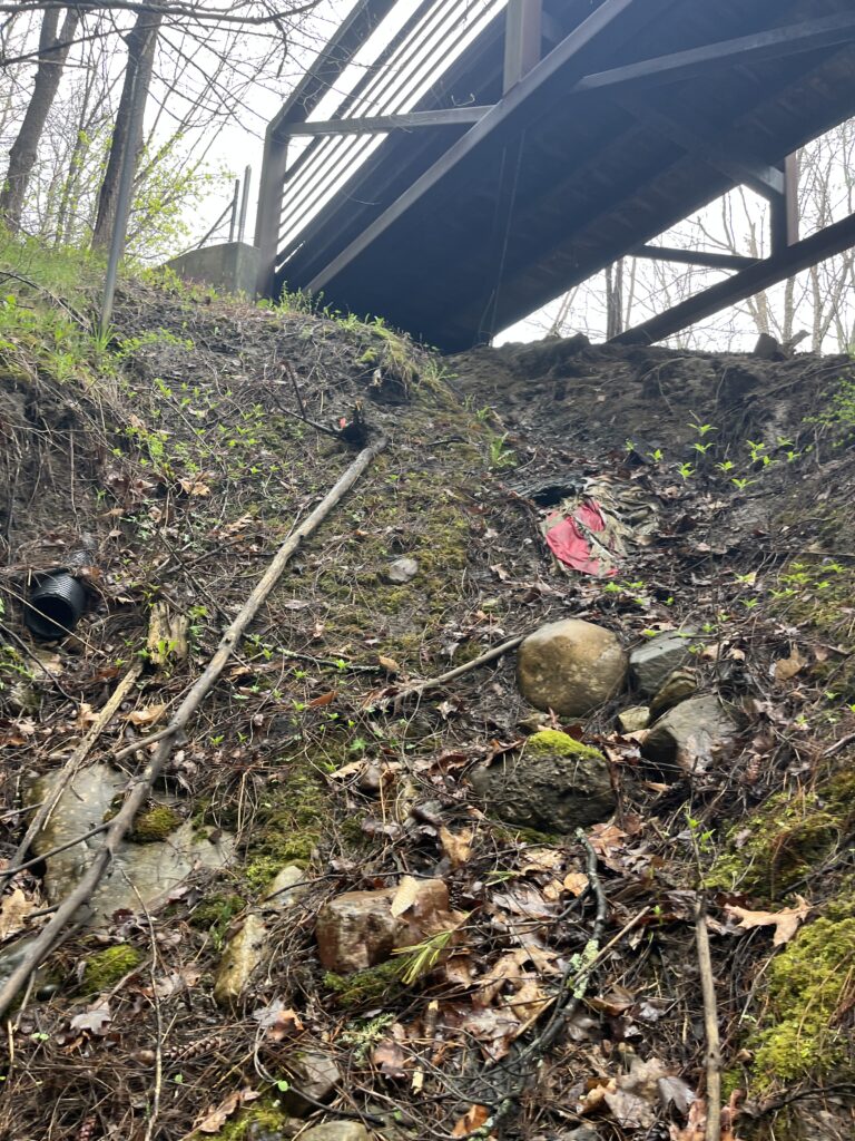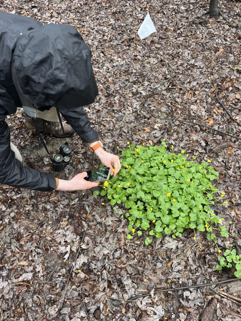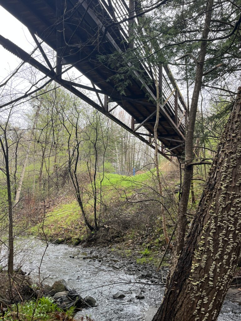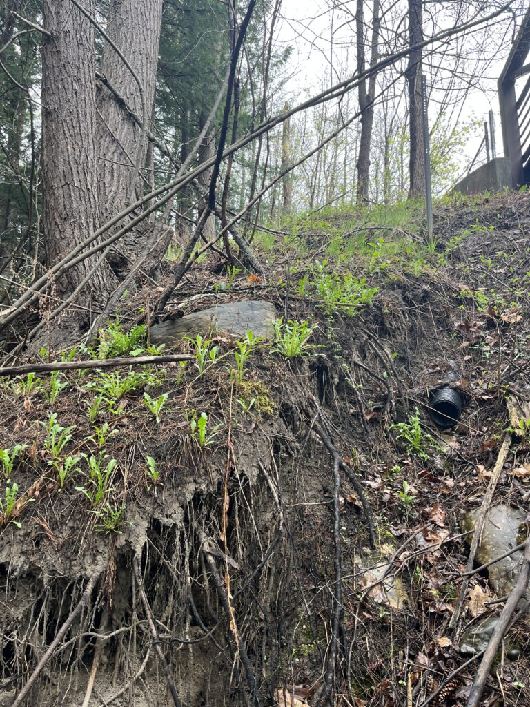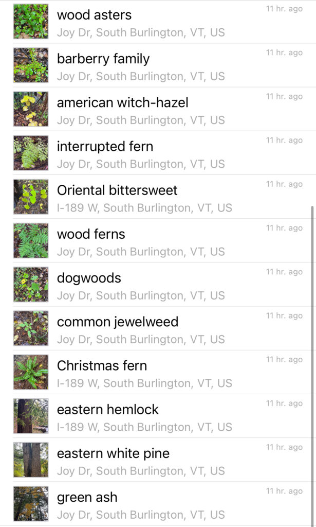 Today, Sunday May 5th, 2025, I visited my phenology spot for the final time this year. Over the course of the past two semesters, my phenology spot along the UVM bike path (and underneath the wooden bridge) has become more than familiar to me, and I truly have enjoyed every single time I have visited it. On this particular visit, I biked over to my spot from WDW around 11:25 a.m., and left around 12:30 p.m. It was raining very lightly throughout the duration of my time spent there, and it was around 52 degrees Fahrenheit outside. I started off by using iNaturalist to identify some of the new plant growth up along the top of the hill, including: