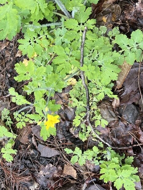 Almost none of this new growth was there the last time I visited my spot, although I believe the Eastern White Pine sapling has been there since before this past fall. It was exciting to see flowers (on the Greater Celandine) and buds (on the Barberry bush) beginning to grow, and the forest floor was covered in more green than I had seen there since October. There was also a lot of moss growing on the rocks in the river, and ferns/grasses growing on the river’s banks. Besides that new plant growth, there were also new fallen branches scattered around the forest floor, likely due to the recent rain and wind storms. These storms have also likely contributed to the recent increase in the river’s flow, and while I was there today it was especially noisy. There is also clear evidence of water flow carving a path down the hill, and the soil was very wet and muddy.