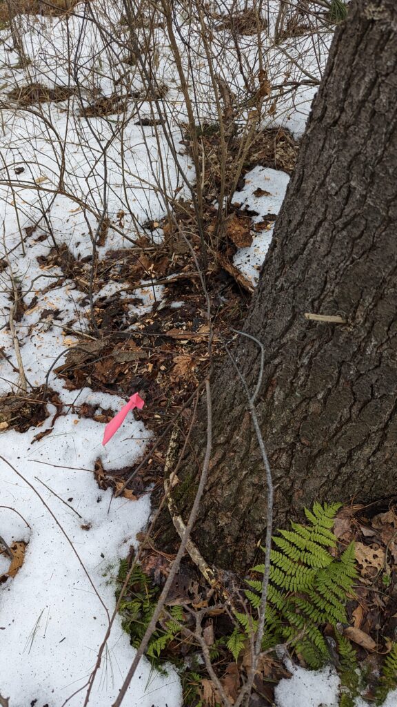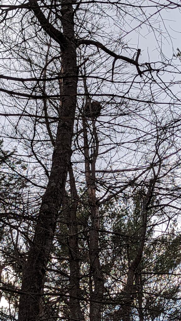 On the first trip on Tuesday, I went alone and down to the stream. Noting nothing there at all, I went back up and crossed the stream into another part. This area was new to me, and here is where I actually heard some species. They were crows and chickadees. (Thankfully, I know what those species are). I sadly didn’t see the birds physically, just the signs of them. Things like nest and calls. Eventually, I headed back.