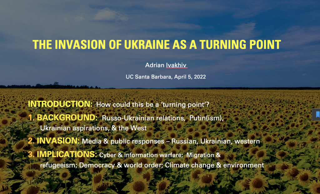 My talk “The Invasion of Ukraine as a Turning Point” tries to make sense of the causes of the Russian invasion and its potential effects on the future of global media, migration and refugeeism, democratic and authoritarian politics, and climate change. It can be viewed here.