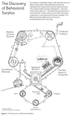 That said, Zuboff’s notion of “behavioral surplus” as the newly found “resource” that is rendered, through Google’s and other companies’ “machine intelligence,” into assets that are commodified as surveillance capital, is original and provocative. Here’s Zuboff’s diagrammatic depiction of that process :