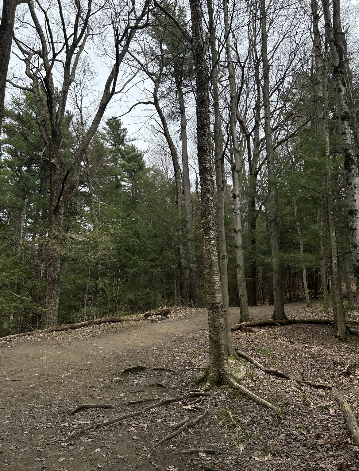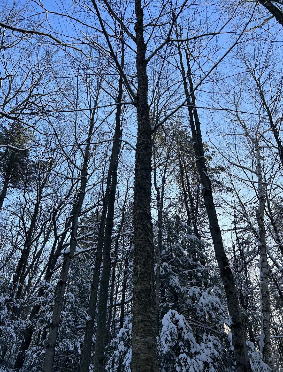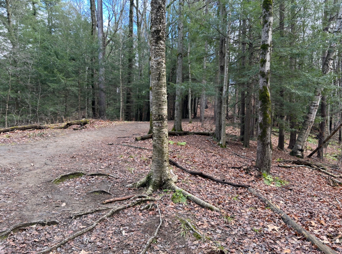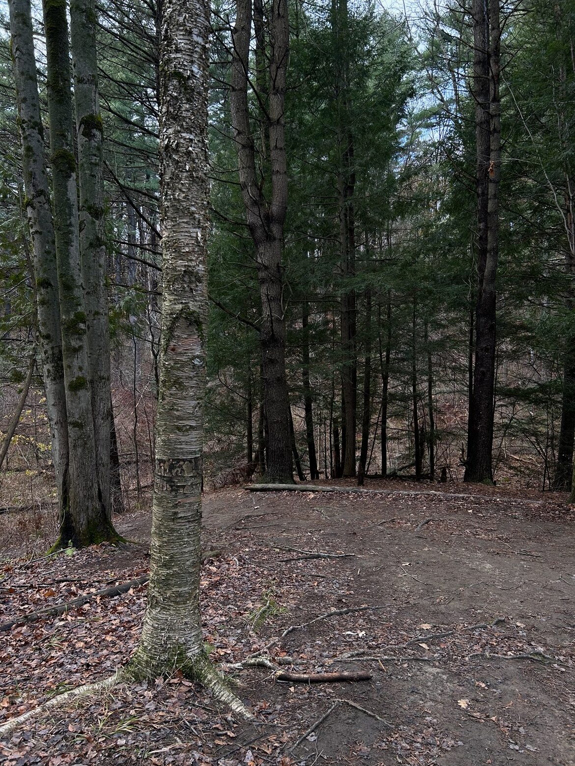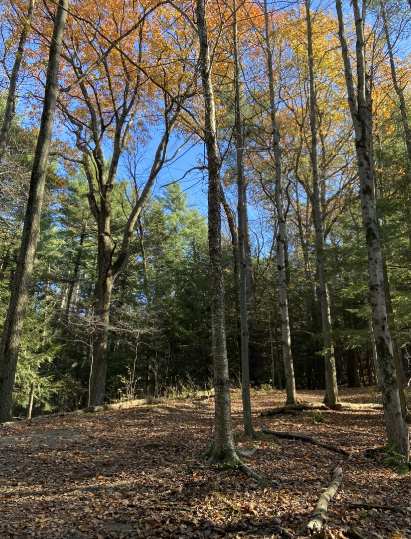 I think my favorite aspect of my spot goes along with how close it is to campus. I walk maybe 10-15 minutes from my dorm and I’m suddenly in this forest which doesn’t make me feel like I’m anywhere near a city. The physical area of my spot I like the best is looking out to the pines and hemlocks from the yellow birch tree. Even now in wintertime, it feels full and nice and green.