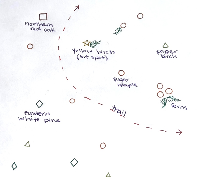 After just enjoying the peacefulness, I drew a little map of my area, with the birch tree at the center of course. Each shape represents a different tree type, at least those I could identify from the species we learned in class.