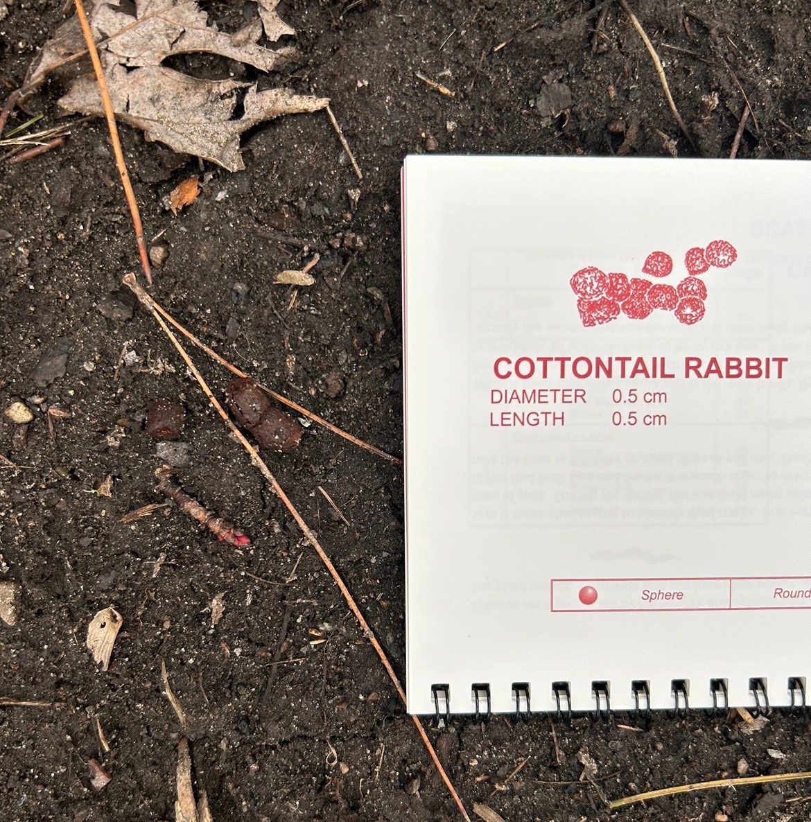 The last find I had of the day was some scat. This one was pretty easy to identify, because it was very round and matched the drawing of the cottontail rabbit scat in the tracks and scat guide to a T.