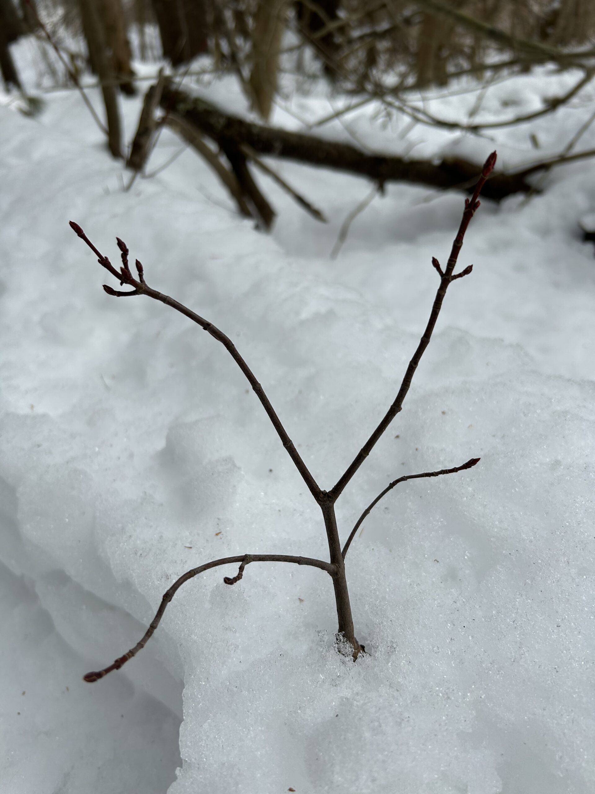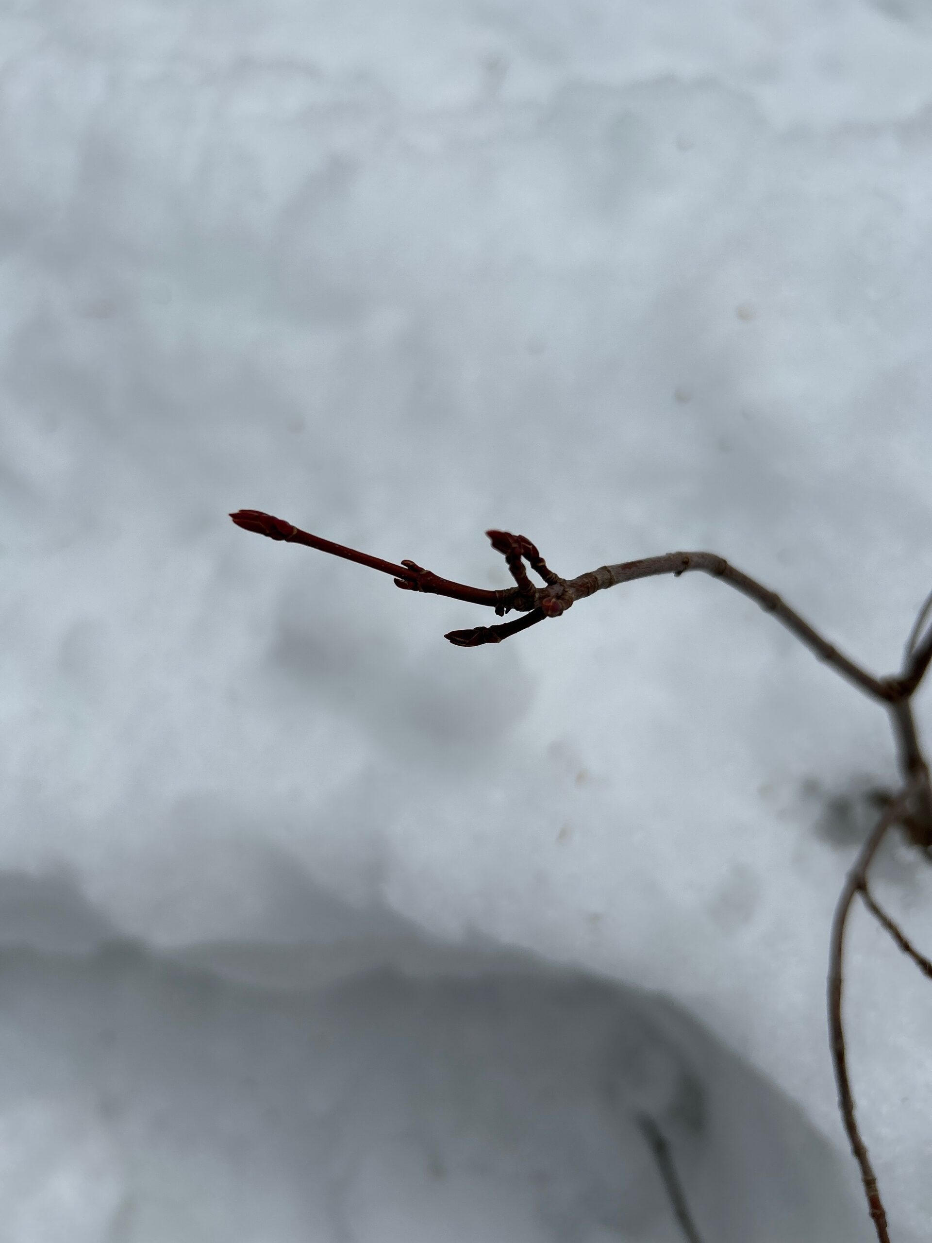 A red maple just poking out of the few inches of snow.