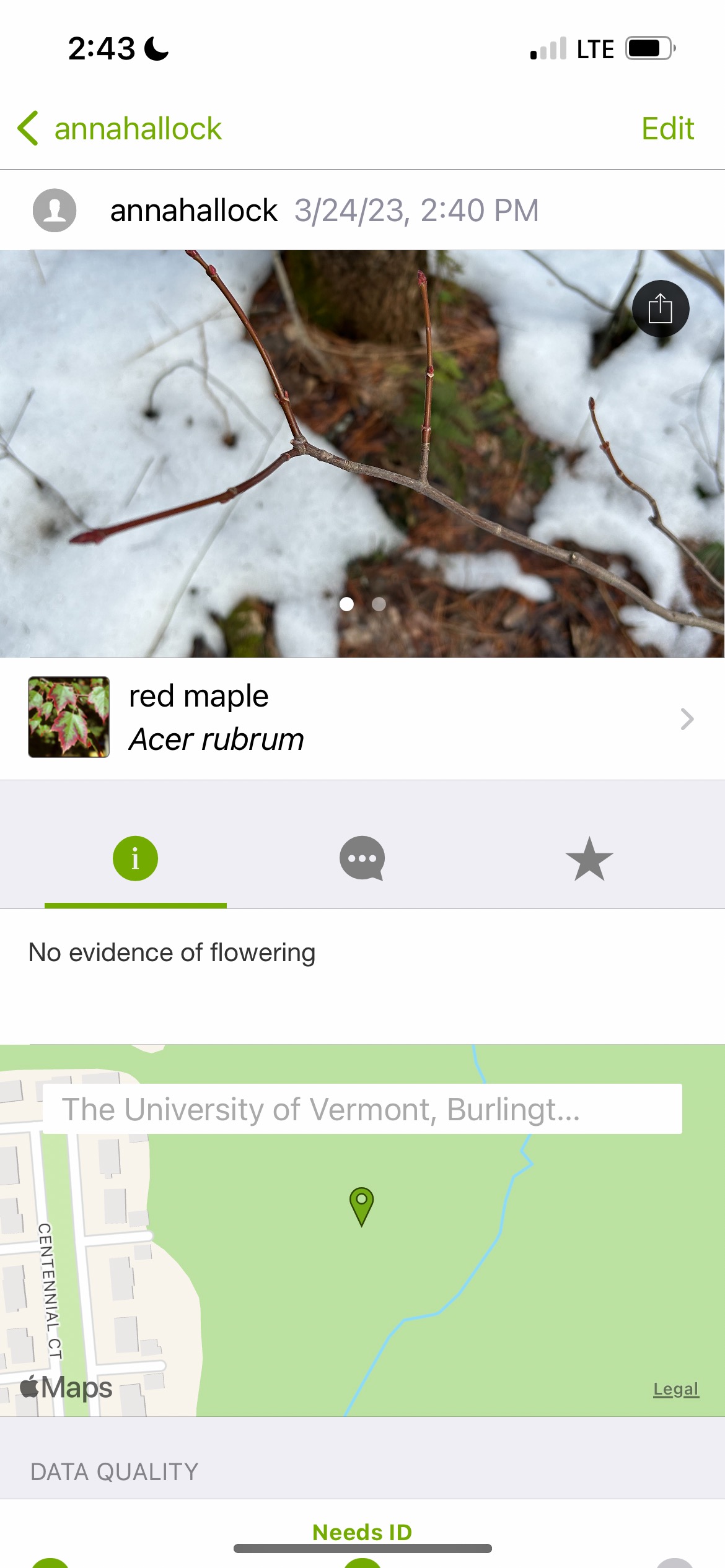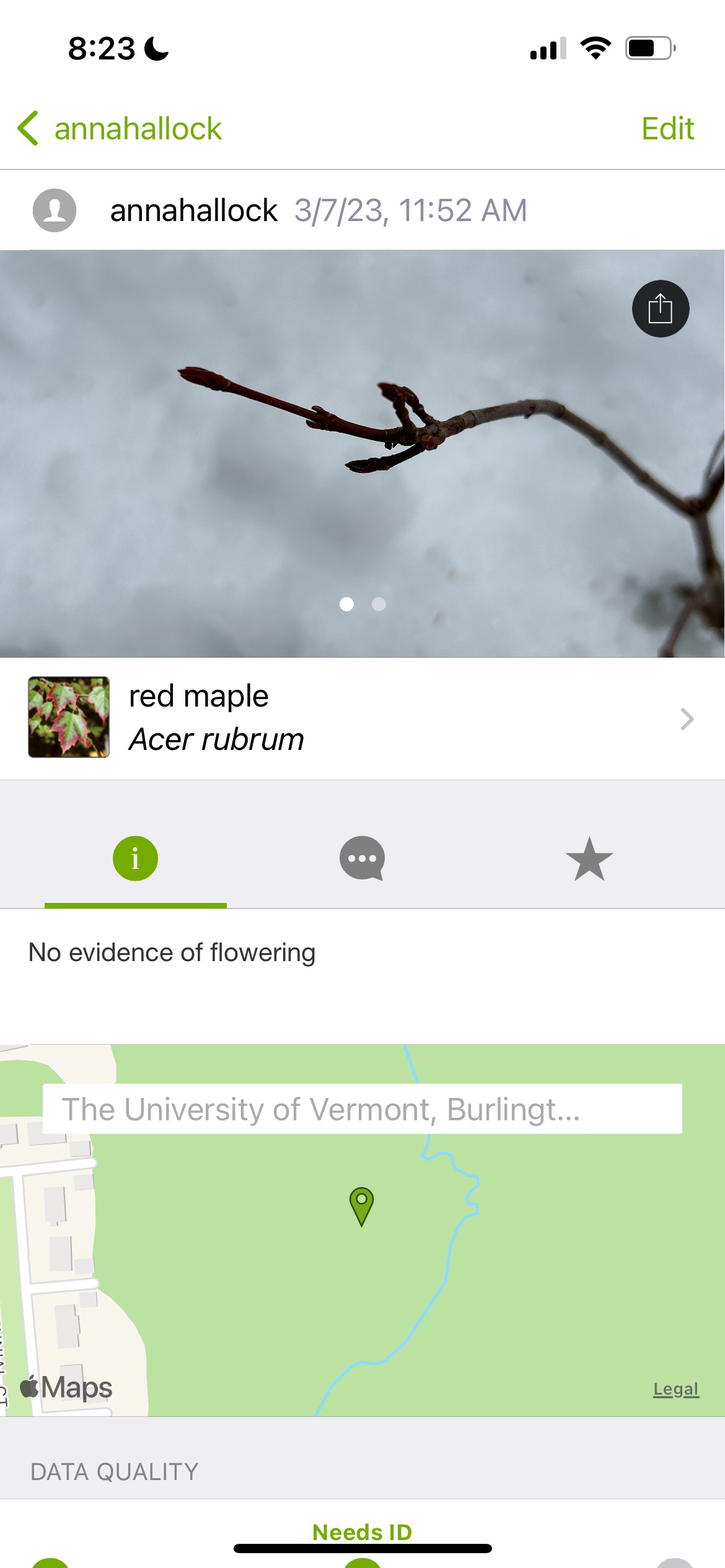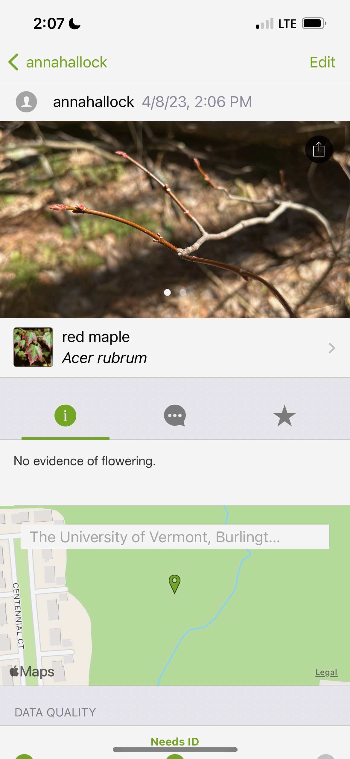 Once I decided that this tree was a red maple, I uploaded my photos to iNaturalist, noting that the state of the tree had no evidence of flowering.