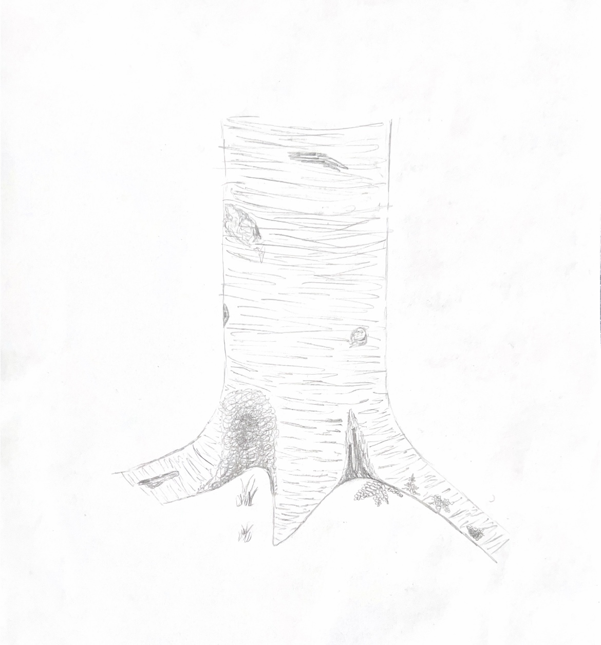 When I made it to my spot, I sat down nearby the yellow birch and did a sketch of its bottom trunk/roots and bark, which I think is so pretty and interesting.