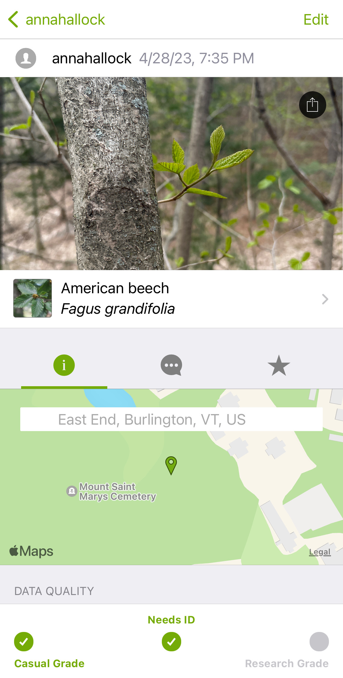 I found that iNaturalist was a super easy platform to use. It was nice when the app would suggest species that the picture might be of, and the suggestions were usually pretty accurate. While I definitely encountered more than just American beeches in those woods, I couldn’t 100% identify any other species so I only made one post.