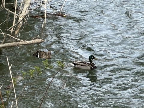 We saw and/or heard a variety of bird species (mallard ducks, a turkey vulture, American robins, American goldfinches, tufted titmice, black-capped chickadees, and red cardinals), saw tracks of deer and river otters, and saw a variety of plant species ( including violets, burdock, nettles, periwinkles, and dandelions) in addition to an abundance of mating boxelder bugs. I made 12 observations on iNaturalist.