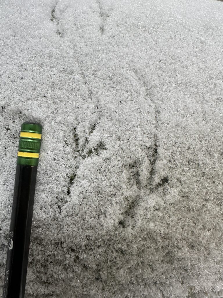 The tracks on the left are some kind of small bird. The tracks on the right look like the hind paws of a squirrel, most likely a red squirrel. I’ve seen them before in my spot, so that wasn’t a surprise. In the middle photo, it looks like there was possibly an interaction between the two. It’s also possible that the squirrel left some food on the log, and the bird came later to scoop it up.