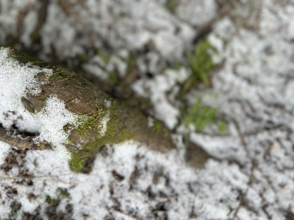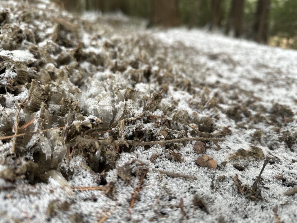 It has snowed a few times already, but this was only the third-or-so snow to stick for a full day. It was also my first time seeing my spot with snow. On the walk to my spot, the mud had a thin crust of ice that cracked and transformed to slush under my feet. Here’s a cool photo of the texture of the frozen ground at my spot: