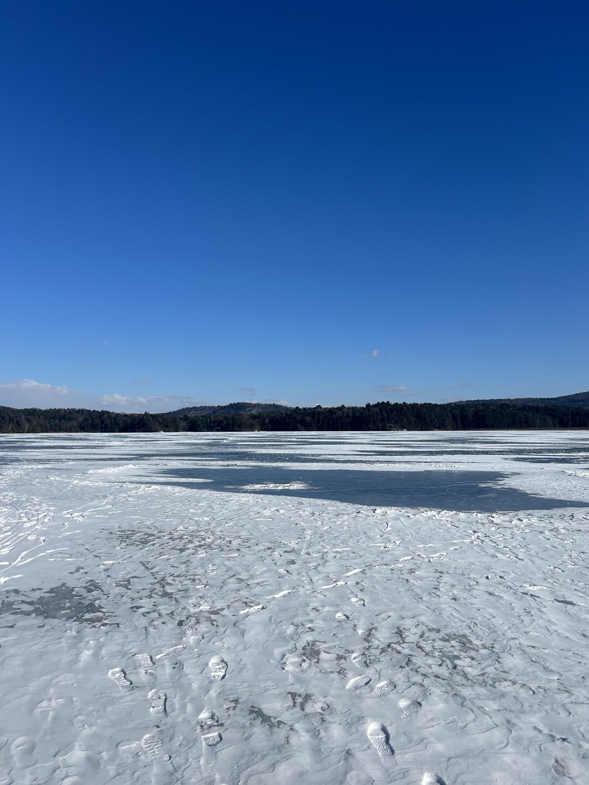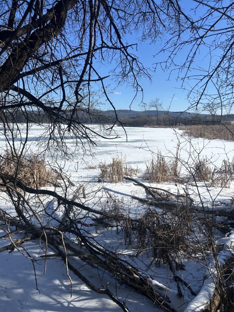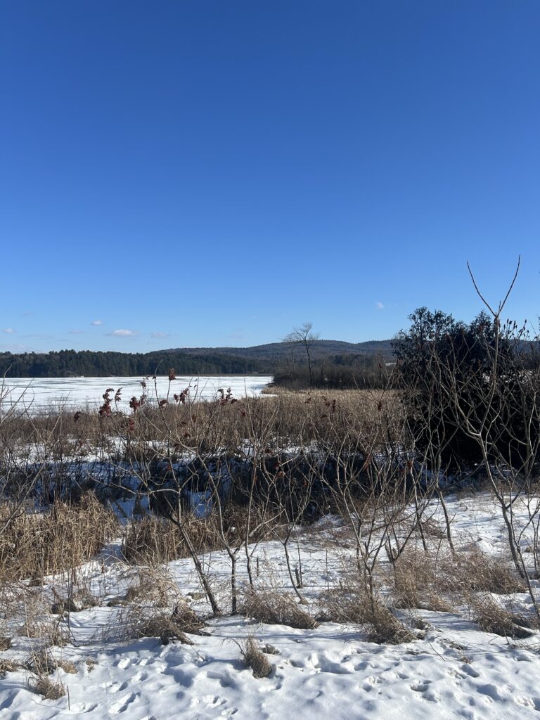 Upon returning to my phenology spot about a month since my last visit, it was clear that many phenological changes have taken place. Due to temperatures dropping to single digits these past few weeks, the entirety of Shelburne Pond was frozen over in a thick layer of ice, with some snow patches. It was such a fun experience to walk out on the ice, view fascinating ice formations, and see my phenology spot from a different perspective. My friend and I even heard some interesting sounds while on the ice, likely from the ice shifting beneath the surface.