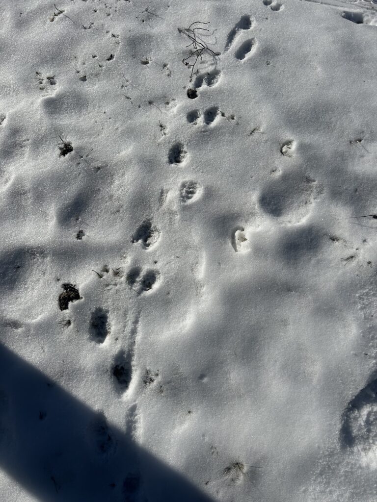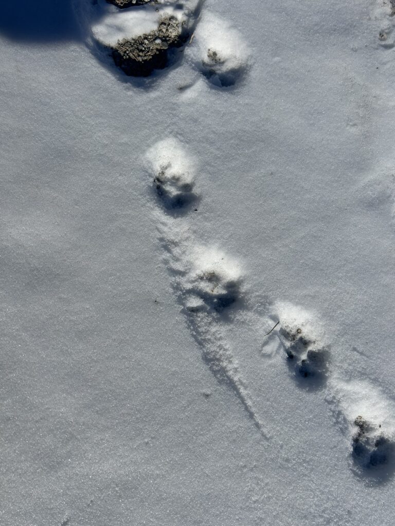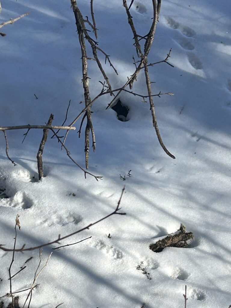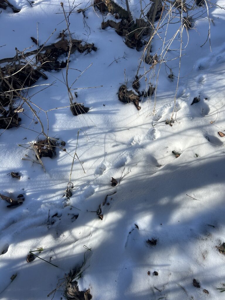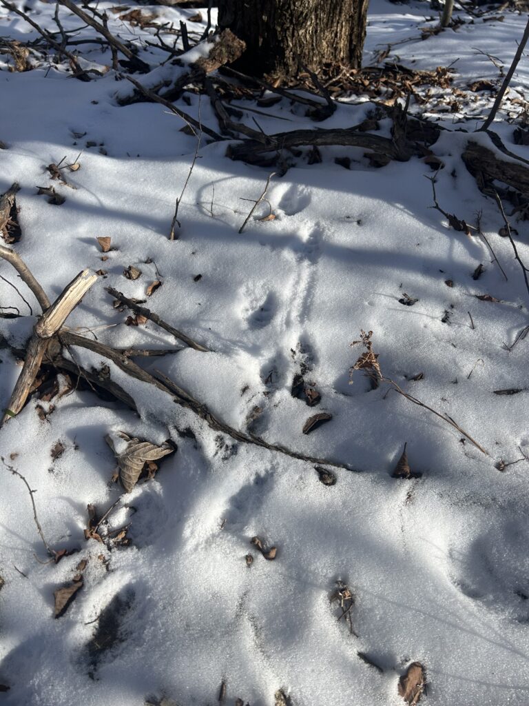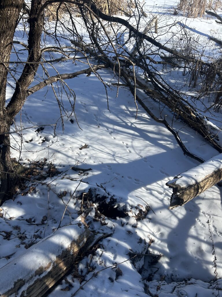 As we made our way to the pond itself, we noticed lots of dog tracks, likely from them joining their human companions on a hike or trip out onto the icey pond. Towards the larger brush area, we noticed a couple patterns of tracks, likely that of skunk due to the shape and pairing of four that we noticed. We observed some tail marks alongside these tracks as they led up the small hill that starts at the pond’s shore. The tracks appeared to be coming from a dense brush pile and an underground burrow at the base of the pond. Alongside these larger tracks, there were a couple small parallel tracks in between, possibly from a small bird. Although the only tracks on the pond itself were that of humans or dogs, we found more skunk and squirrel tracks lining the edges of the Northern White Cedars and Oaks.
