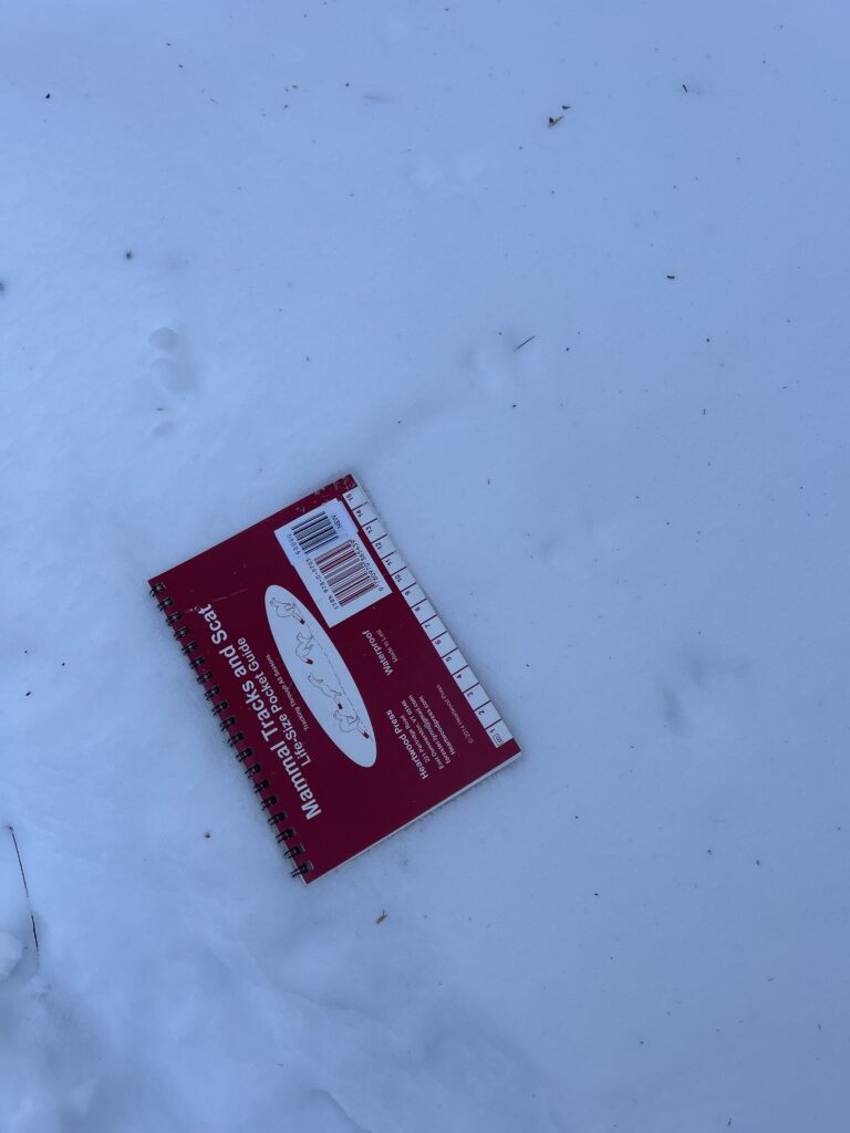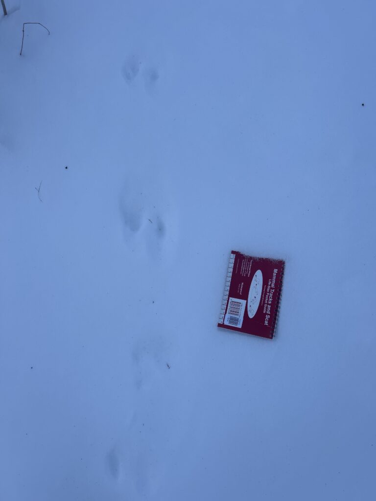 For this week’s phenology post, a peer and I decided to visit Centennial Woods, right down the road from campus, to observe some winter signs of wildlife. After taking the short walk there, we were met with several inches of snow; we took the fairly well-traveled path into the woods and stepped off-trail to follow a few wildlife trails. Within the first few minutes, we made our first observation of a clear galloping gait pattern between a group of old Eastern white pines. The tracks were arranged in parallel groups of four, with the two in the front somewhat larger. The more distinctive tracks were around 2 to 3 inches long and about an inch deep, with a stride of around 6-8 inches. After consulting our field guide, we believed the galloping gait pattern to be that of either a squirrel or a rabbit. However, because the tracks are on the smaller side (around 12 cm according to the guide) and arranged side by side (as opposed to diagonally), we concluded that these tracks belonged to a grey squirrel. Later, we found another distinctive galloping gait pattern but were unable to get an up-close picture due to the thick snow layer. These tracks appeared larger and more similar to that of a rabbit.