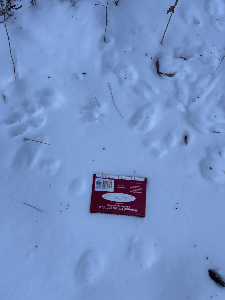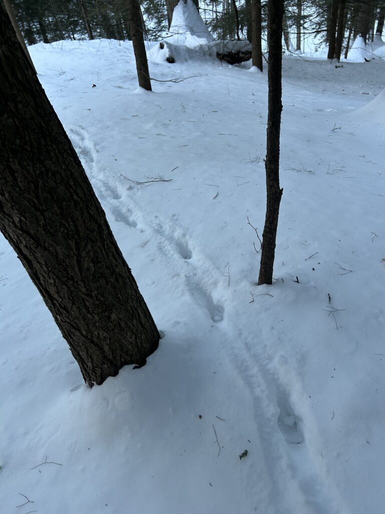 During our time at Centennial, we came across many mystery tracks that we were unsure of their owner. One trail had very long drag marks and a diagonal gait pattern. The trail abruptly started beneath a tree and seemed to disappear before merging into the main trail. Because of the snow’s depth, it was hard to make out any clear print. We hypothesized that it belonged either to a dog or a deer who also display diagonal gait patterns.