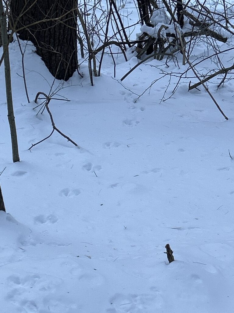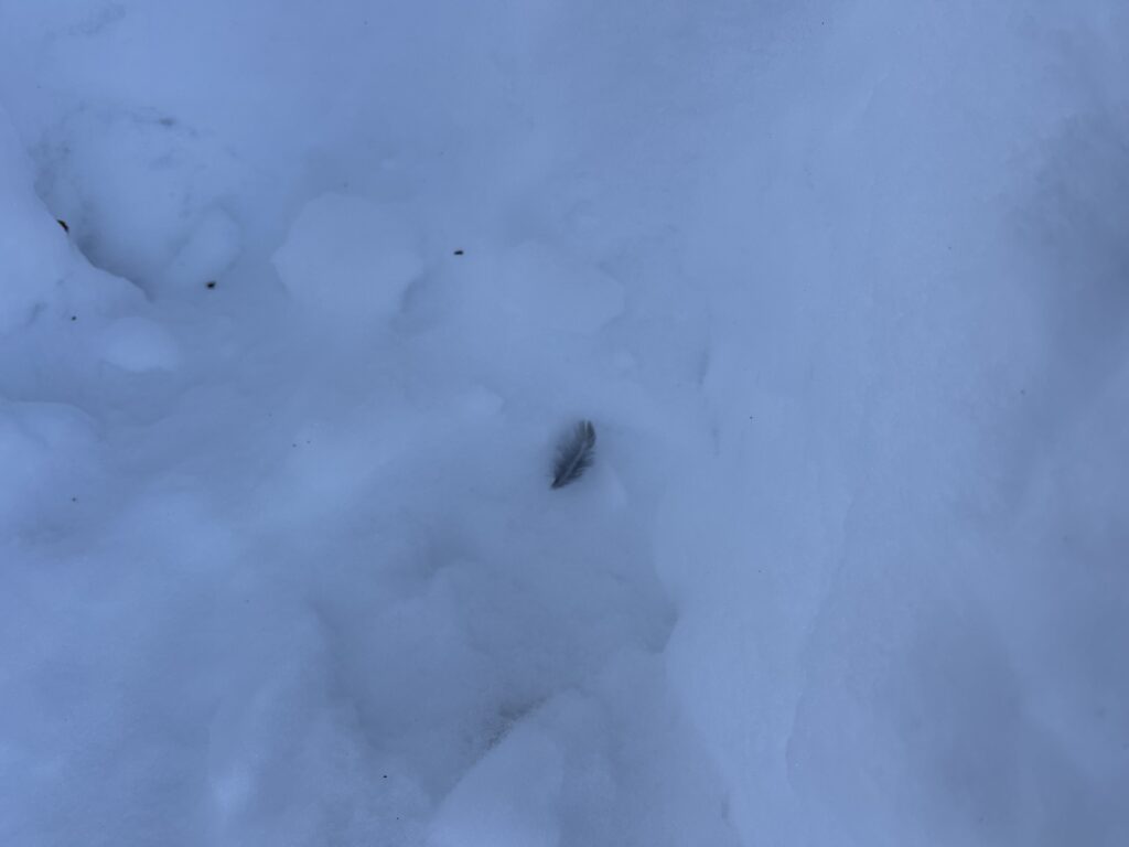As we continued our journey, we found a couple of trails of very small bird tracks, including a fallen grey feather. Making our way deeper into the forest, we came across what first appeared to be deer tracks, but after closer inspection, they appeared to be additional squirrel tracks. The tracks were all situated near a large brush pile, and deer tracks would likely have gone deeper into the thick snow layer compared to these, likely from a smaller animal like a squirrel.
