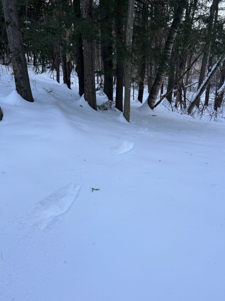 Additionally, there was a group of large impressions in the snow about 2 feet apart. No tracks were easily visible, but the impressions appeared to have 2 drag marks extending from the top and bottom. It appeared that a larger animal was running and jumping through the snow.
