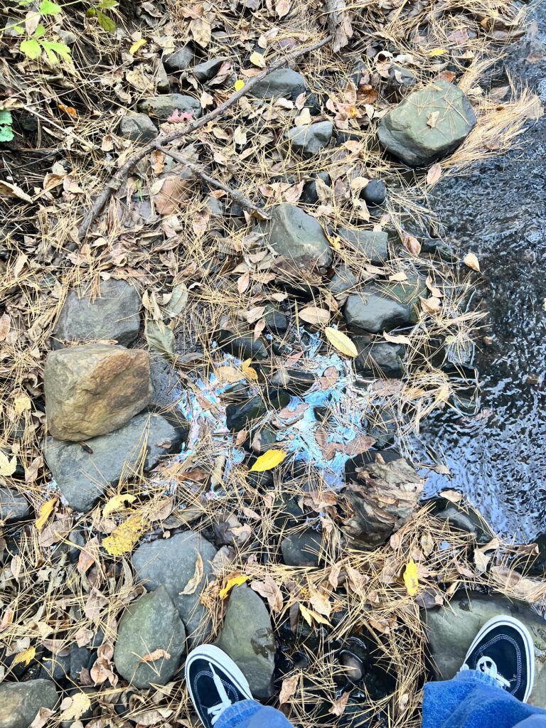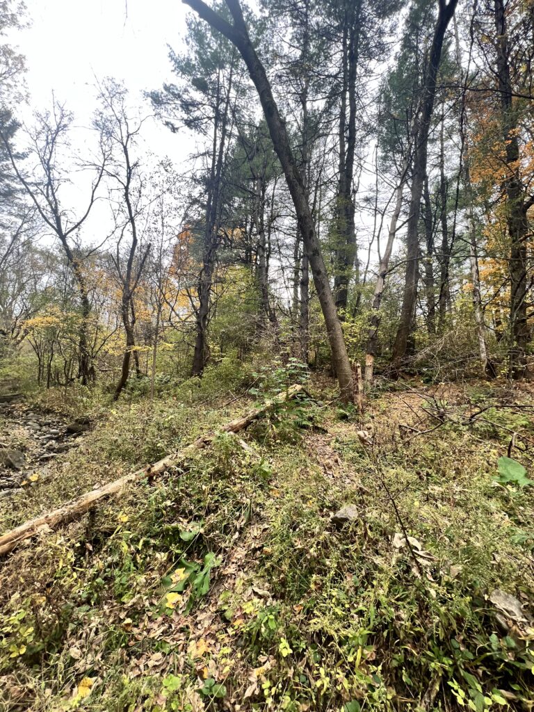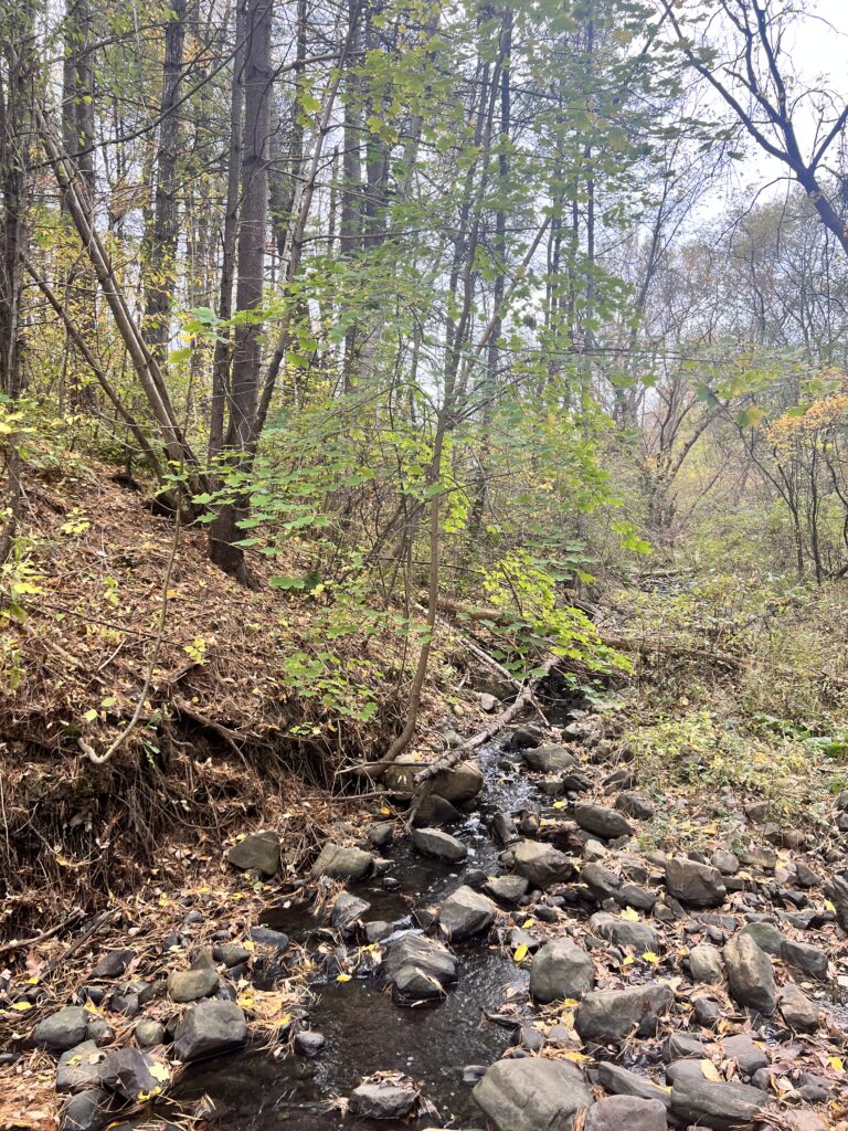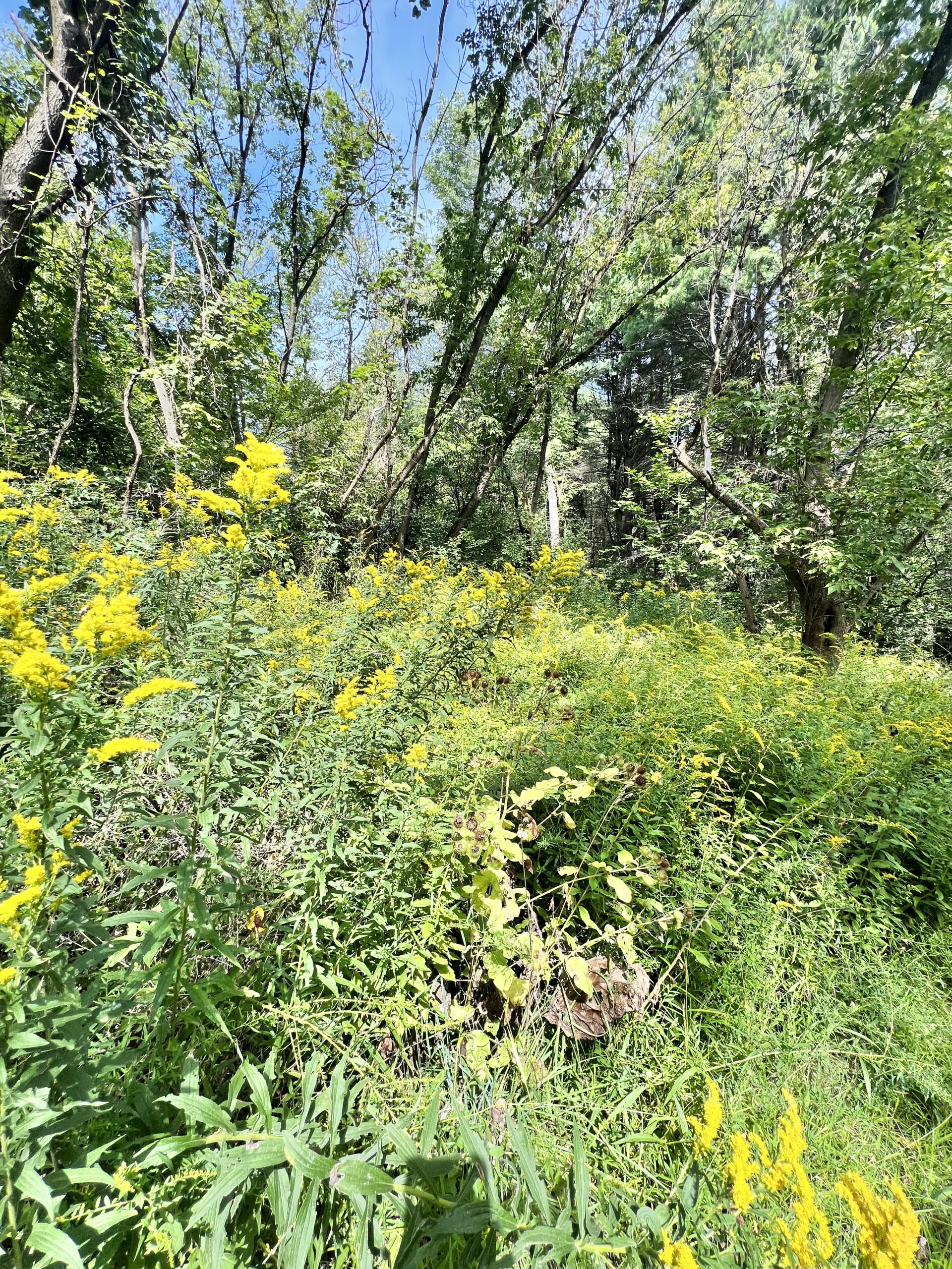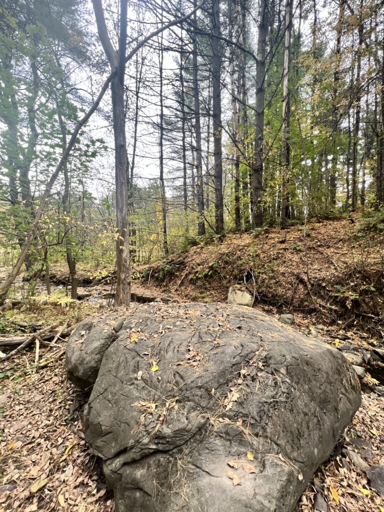 my first visit to this solitary stone ( September 17th, 2022). The vegetation was still in full swing, with some Canada Goldenrod shows in the left picture. The creek was crystal clear with a bustle of ferns and smaller leafy plants lining the banks.