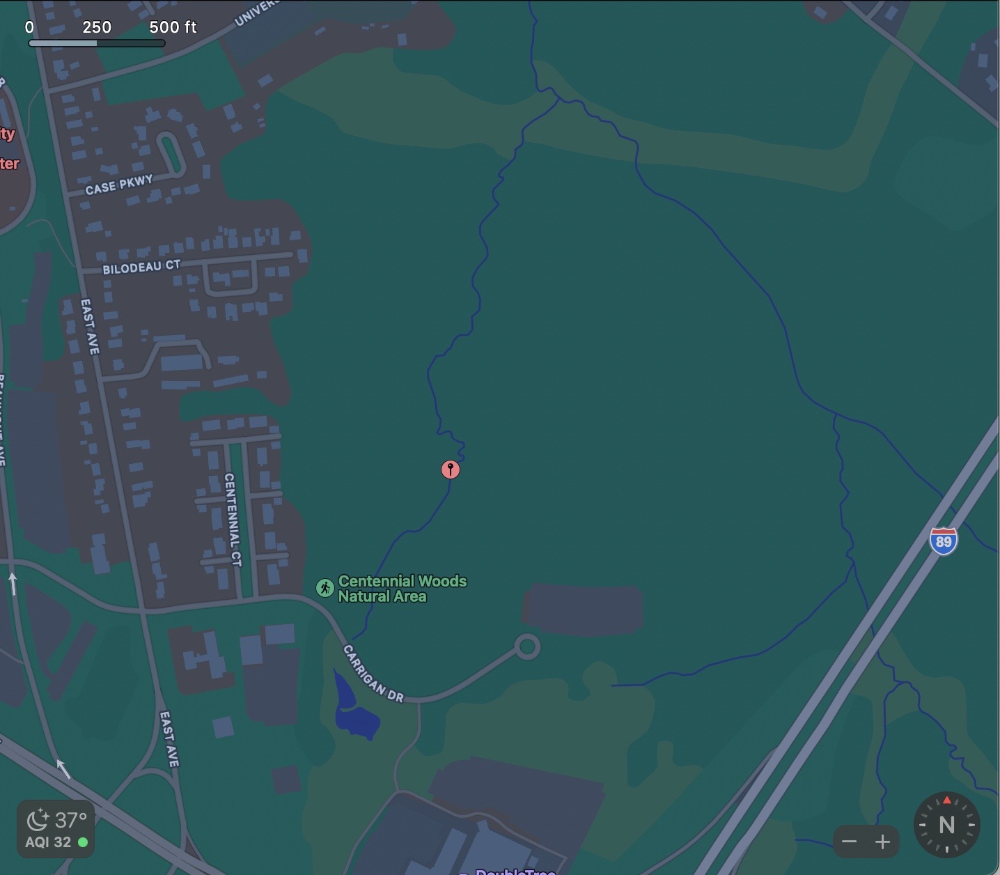 (44.47648° N, 73.18642° W) the coordinates and map location of the secret slab on the creek. To get to this mysterious mineral, one must take the centennial woods main trail down about two minutes. After walking for a bit you can look to your right to see an opening to the creek to your right. Walk down about a hundred feet, duck your head under some shrubbery, and there you will find her, in all her magnificence.