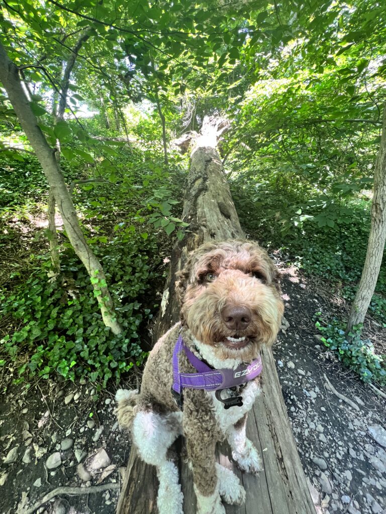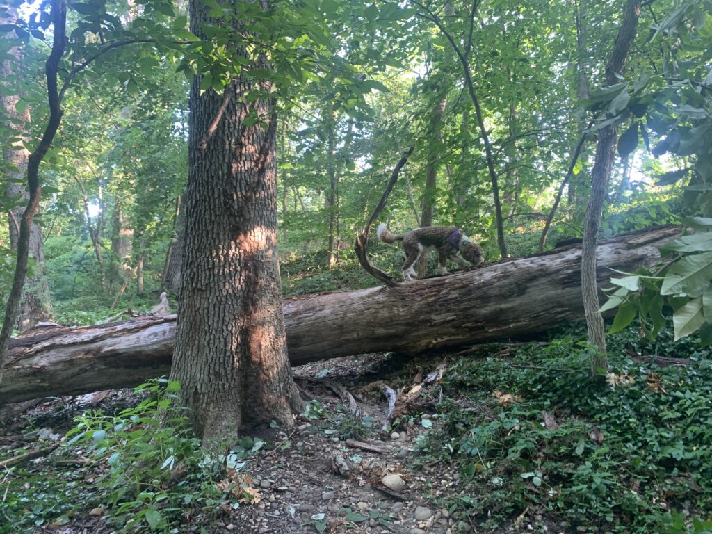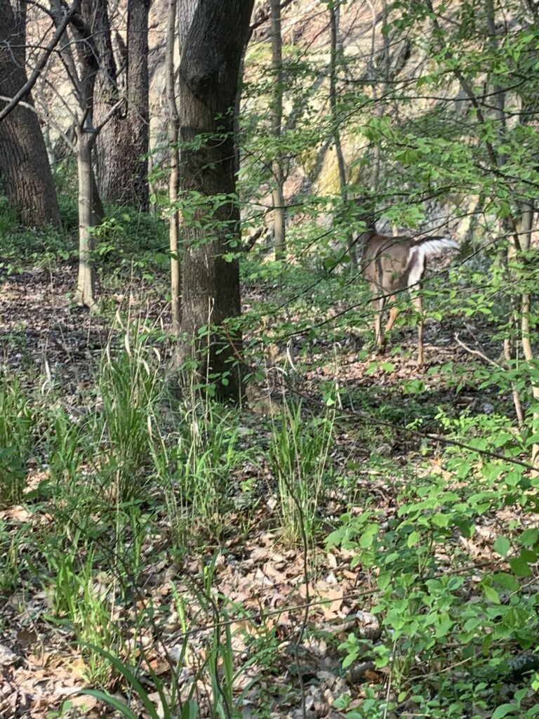 This is my phenology location for my hometown of Washington, DC! This fallen tree is a landmark on the hike that I like to take with my dog almost every day. This little section of the huge natural area that runs through all of DC called Rock Creek Park is only a few blocks from my house and very accessible to my neighborhood. This tree has been here for the past three years, ever since we have had my dog, and I remember when she was a puppy and I would have to lift her over the tree so we could keep walking. Now we usually sit on the tree for a little and I take a picture of her (shown above) and we both stop to look at the beautiful forest-scape surrounding us. Compared to my phenology location in Centennial Woods here in Burlington, there is much more undergrowth, possibly because it is less up-kept area and the only area that does not have undergrowth is the path area. There are many tall, older oak and maple trees and very few evergreen trees such as the pines that are more common in my VT location. I hope you guys liked seeing some pictures of Stella and a deer that we saw one time!