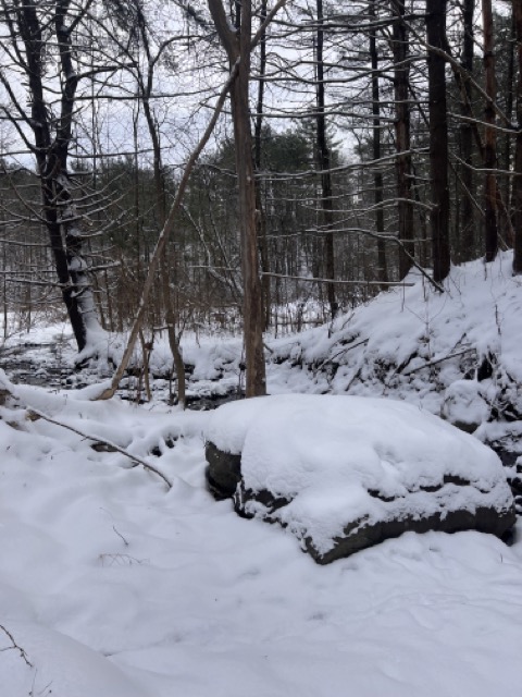 When I sat and closed my eyes while sitting on the mysterious marble I listened to the flowing of the creek. It was a sound that overcame most of the other wildlife chatter such as the birds and the creaking of the branches from the trees above me. I heard the creek flow, and I as I sat for longer and longer I thought I could hear when it picked up pace from time to time. Then I focused on the animal noises, not many but a few birds I could hear every so often would catch my (ear??) and it was extremely pleasant. I heard pine needles and leaves brushing against one another when the wind picked up and their dried corpses lied on the ground, tumbling and falling over each other. This takes me to the changed I observed as I returned to my sacred stone in the woods. During my last visit, most of the leaves had fallen from the surrounding vegetation but still kept their yellow and red tinted color as they lay on the forest floor. To my disappointment, when I returned today, they had all turned a sickly brown, rotting color- becoming part of the forest once again.