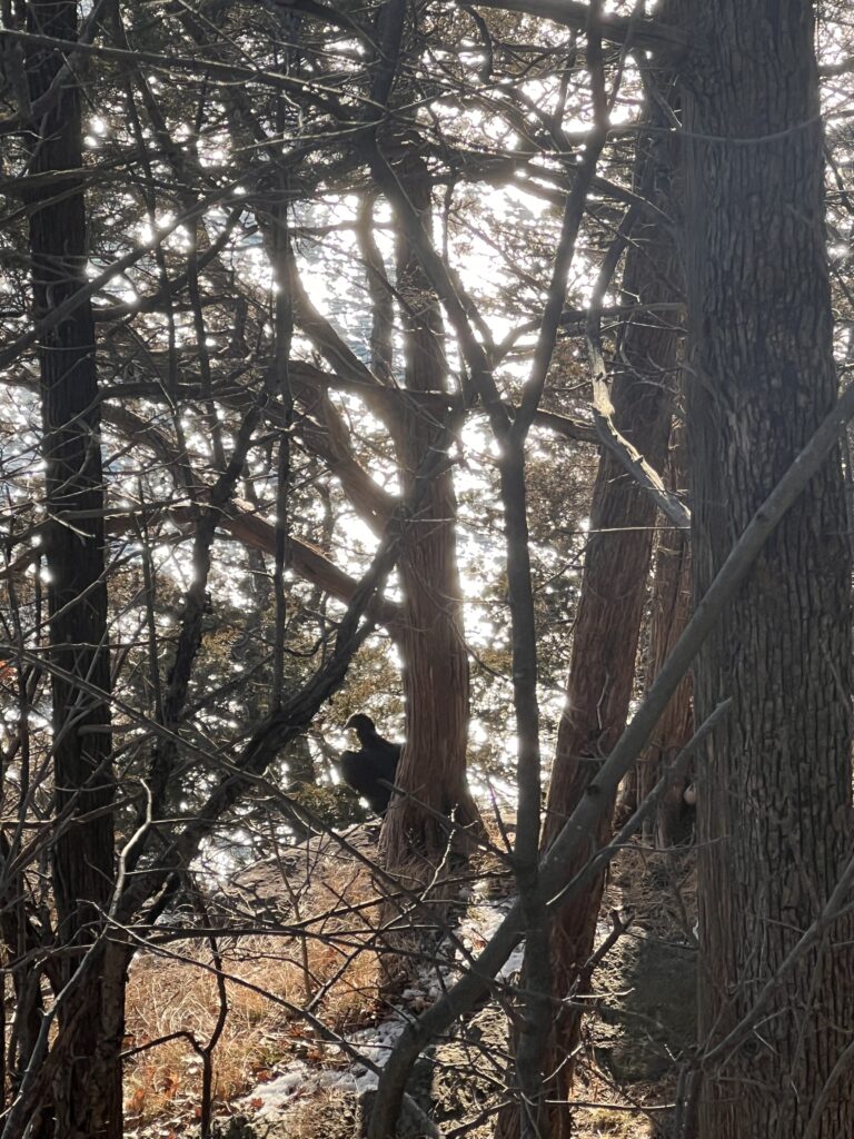 Me and some friends took a journey to Red Rocks and found a large bird. We took a picture of the bird and put it into iNaturalist to find out it was most likely a black vulture, which are common in wooded areas of vermont. We got very close to the bird and realized it would not back down off of its branch, which led us to believe it had its eggs in that very tree and was protecting them.