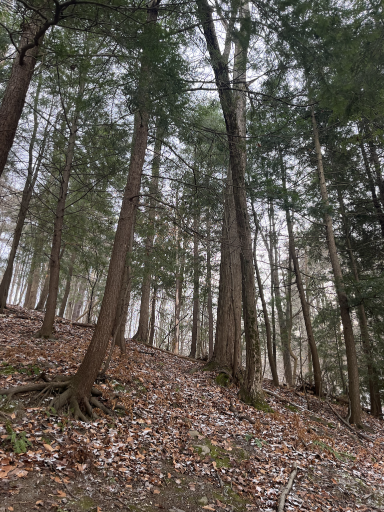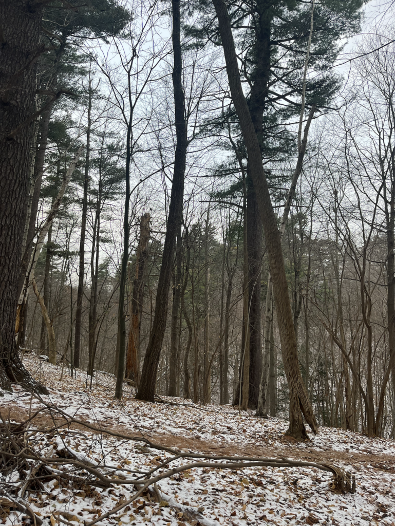 At Trinity Woods this morning, the most apparent change since the last visit in October was the amount of fallen trees, likely having fallen because of colder temperatures and recent winds. There were trees on the trail, and tons on the slopes going down to the small creek. Trees looked more empty and it was easier to see through the overstory, and there were a lot more leaves scattered on the ground. Also, the creek had grown slightly bigger, the flow was more noticeable, and the water was deeper and seemed to have a slightly different path.