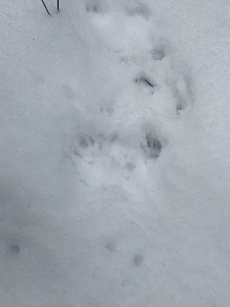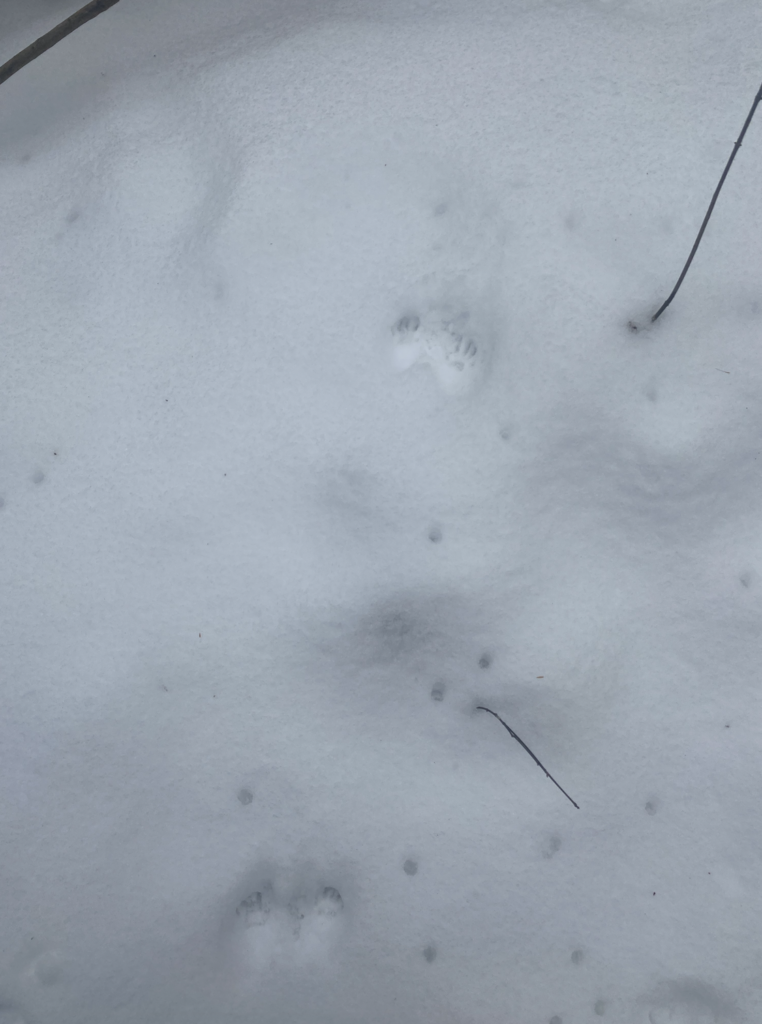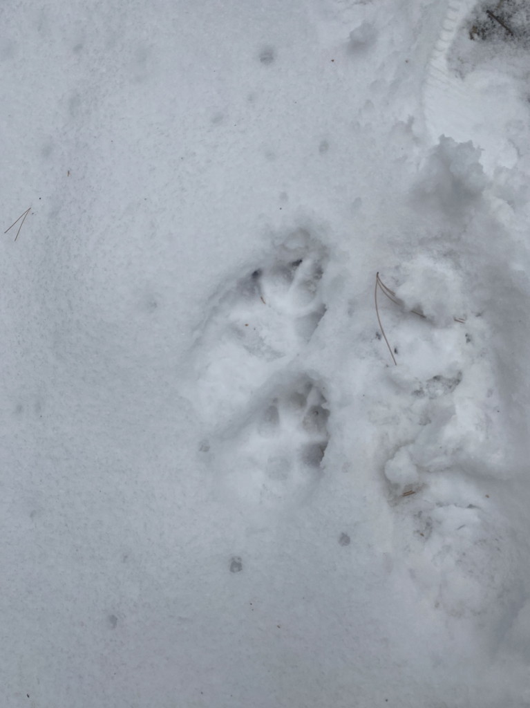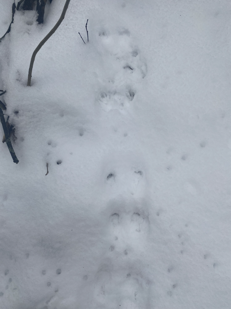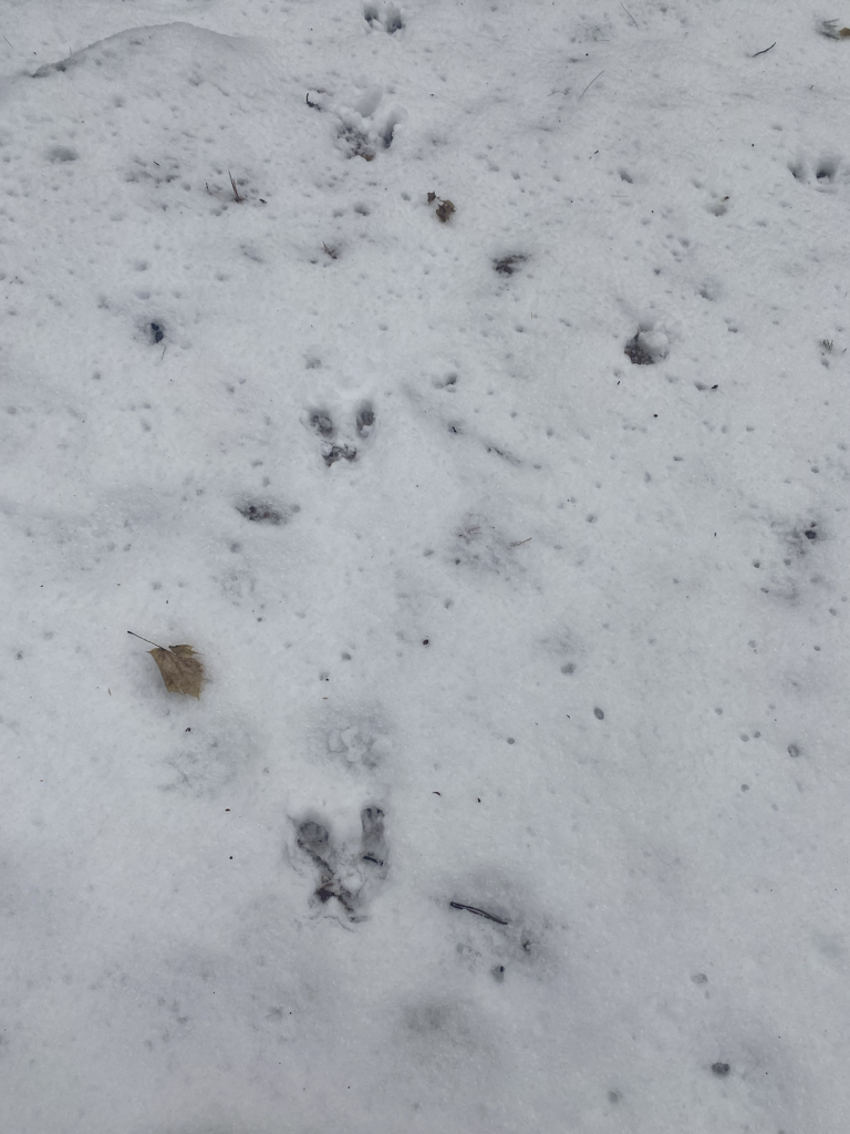 The main animal we found a lot of was squirrel. Its hard to distinguish the difference between squirrel and rabbit tracks, especially since we didn’t see any of the actual animals. However, with some of the tracks leading directly to a tree and some having the hind paws in front of the front paws (a notable part of a squirrel’s walking pattern), we could assume there were lots of squirrels in the area and the tracks likely belonged to them. It was also interesting to find this because I didn’t see any squirrel nests in the trees, so I wonder if squirrels were just investigating and scavenging in the area, or if they are living in different parts of the trees.